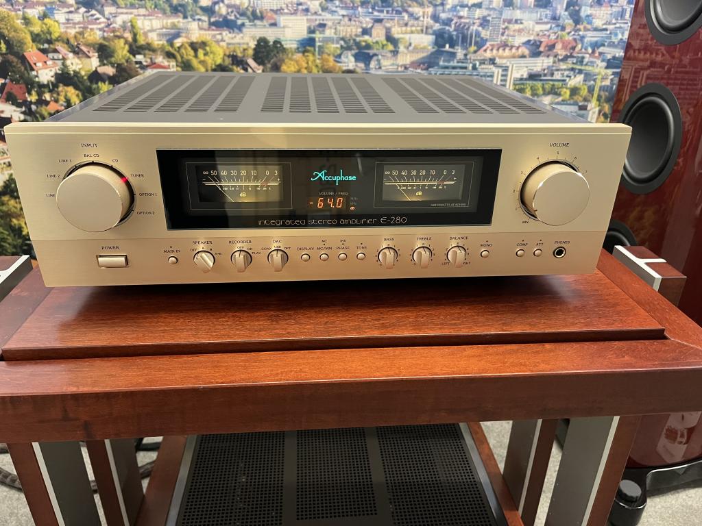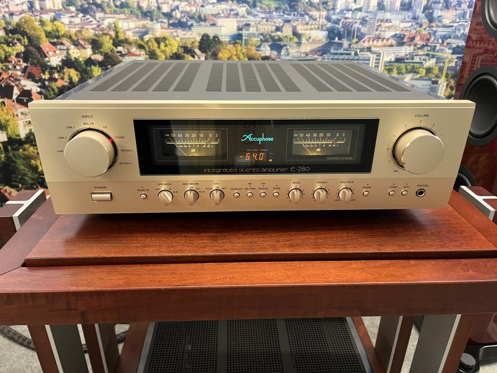 In Qualität und Leistung bewegt sich der E-280 auf dem Niveau von weit teureren High-End-Vollverstärkern, oder übertrifft diese sogar. Der E-280 profitiert dabei von der Technologie, die Accuphase für seine Highend Verstärker seit nun fast 50 Jahren ständig weiterentwickelt hat. Die revolutionäre AAVA-Lautstärkeregelung, Endstufen mit hoch belastbaren bipolaren Leistungstransistoren, ein auf Stabilität optimiertes Netzteil, sind nur einige wenige Highlights des E-280. Die von Accuphase angewandte „Balanced Remote Sensing“-Technik sorgt für optimale Signalkontrolle.Diese Signalkontrolle nahe an der Lautsprecherklemmen, reguliert die symmetrische Rückkopplung in Signal- und Masseleitungen, was zu einer Absenkung des Innenwiderstands der Ausgangsstufe führt und einen hohen Dämpfungsfaktor von 500 ermöglicht. Dieses entspricht einer Verbesserung um 25 % gegenüber dem Accuphase E-270! Der E-280 zeigt souveräne Kontrolle über die am Verstärker angeschlossenen Lautsprecher. Signalstrom-Rückkopplungstechnik sorgt auch für hervorragendes Phasenverhalten im oberen Frequenzbereich und das Instrumentationsverstärkerprinzip in der Endstufe erlaubt eine voll symmetrische Signalübertragung. Die Schutzschaltungen des E-280 arbeiten komplett ohne mechanische Kontakte, dies wird durch die Verwendung von MOS-FET-Schaltern mit hoher Belastbarkeit erreicht. Zudem lässt sich der Vollverstärker E-280 nun mit zwei Optionsplatinen-Plätze einfach erweitern: Die Phono-Platine AD-50 ist für Ihren Plattenspieler der rauscharme Entzerrer-Vorverstärker. Die digitale Wandler-Platine DAC-50 ermöglicht den direkten Abschluss digitaler Hi-Res Geräte, das Display stellt die Sampling Frequenz im MHz Bereich dar. Der Klang des E-280 übertrifft in seiner Klasse alle Vorstellungen.