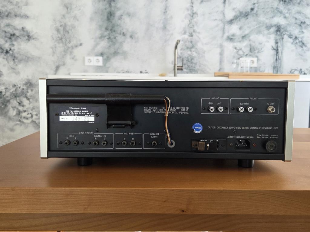 Der T-100 gehört zu den 3-5 weltbesten UKW-Tunern, ein legendärer Tuner mit hochwertiger Verarbeitung, umfangreicher Schaltungstechnik, durchdachtem Aufbau in Gruppen, fünffach-Drehkondensator, rauscharmen Dual-Gate-MOS-FETs, usw. usw., weitere Details in HiFiWiki. Abmessungen: 445 x 355 x 152 , 14Kg.