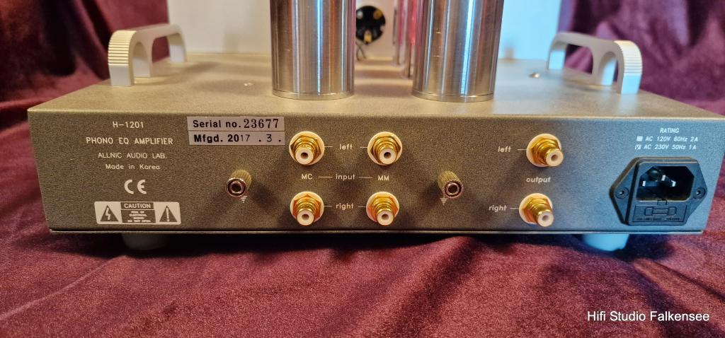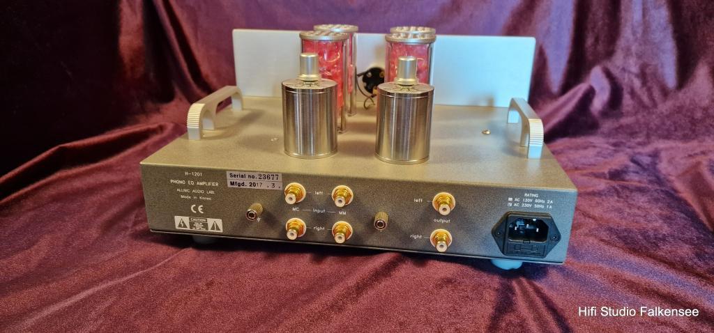The H-1201 possesses some, but not all of the technical features found in the H-3000V. The H-1201 uses Allnic's proprietary Permalloy transformer cores within its step-up transformers (the same transformer cores are used in all Allnic phono amplifiers), there is no negative feedback, and it operates in pure Class-A mode. However, the elaborate LCR RIAA type filter has been replaced with a simpler, more cost effective CR type filter (one that is precisely compensated to within +/- 0.3dB.), while voltage regulation and the power supply are transistor based (rather than tube-based as with the H-3000V LCR).