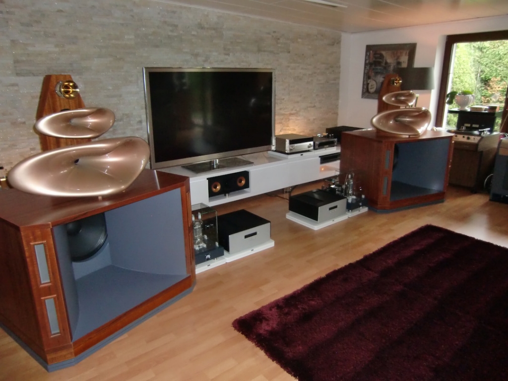 Aus Privatbesitz !! Zum ersten Mal wird weltweit ein Vier-Wege-Hornsystem komplett mit Alnico-Treibern von JBL präsentiert. Das Resultat ist eine Klangqualität, die ihres gleichen sucht. Bestückt ist das System mit:Bass: JBL K151 - der einzige 18 Zoll Alnico Bass von JBLMittelton: JBL 375 - 2 Zoll Treiber mit neuem Bariliummembran Mittelhochton: JBL LE85 - 1 Zoll Treiber Hochton: JBL 077 mit blauem MembranBassgehäuse: JBL Doppelvoice, umgerechnet und gebaut für einmal 18 Zoll JBL BassEchtholzfunrnier Tineo und Lackierung in anthrazit Absorberplattform: SSC Twinbase - Spezialanfertigung für diesen HornlautsprecherInnenverkabelung Bass: Oyaide Innverkabelung Mittelhochton: OSH KabelFür dieses System wurde eine spezielle Vier-Wege-Weiche entwickelt, deren Klangqualität bis jetzt nicht zu erhalten war auf dem Weltmarkt. Das System kann mit einer oder bis zu vier Endstufen betrieben werden. Die Drei-Wege für den Mittelhochton sind regelbar und flexibel an den Raum anpassbar. Resultat Weltspitze