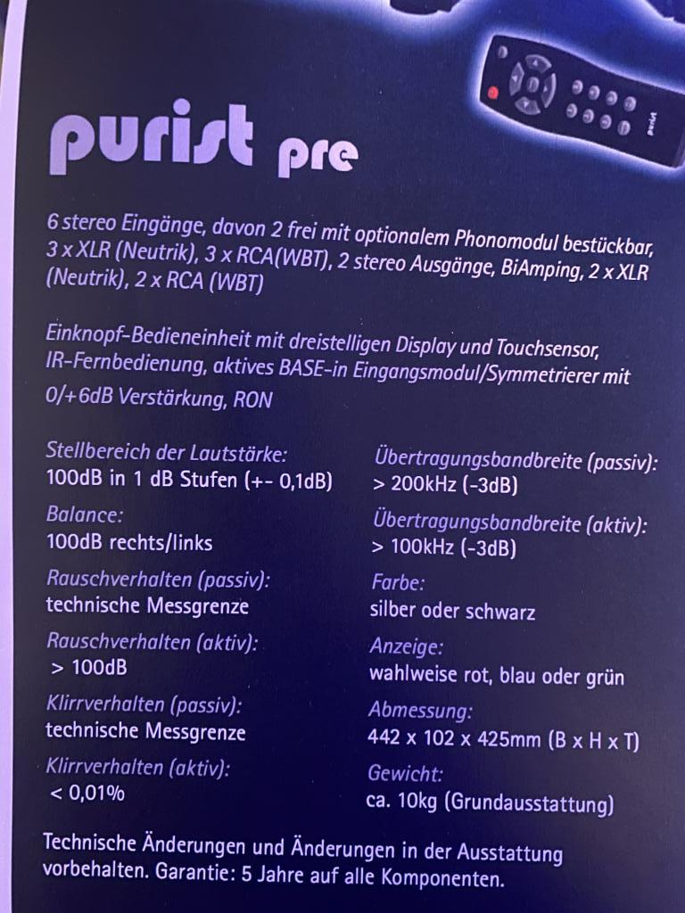 Purist PRE / 6 XLR, RCA Eingänge / Übertragungsbandbreite (passiv) > 200kHz (-3dB), (aktiv) > 100kHz (-3dB) / Klirrverhalten (aktiv) < 0.01% / modulares Konzept