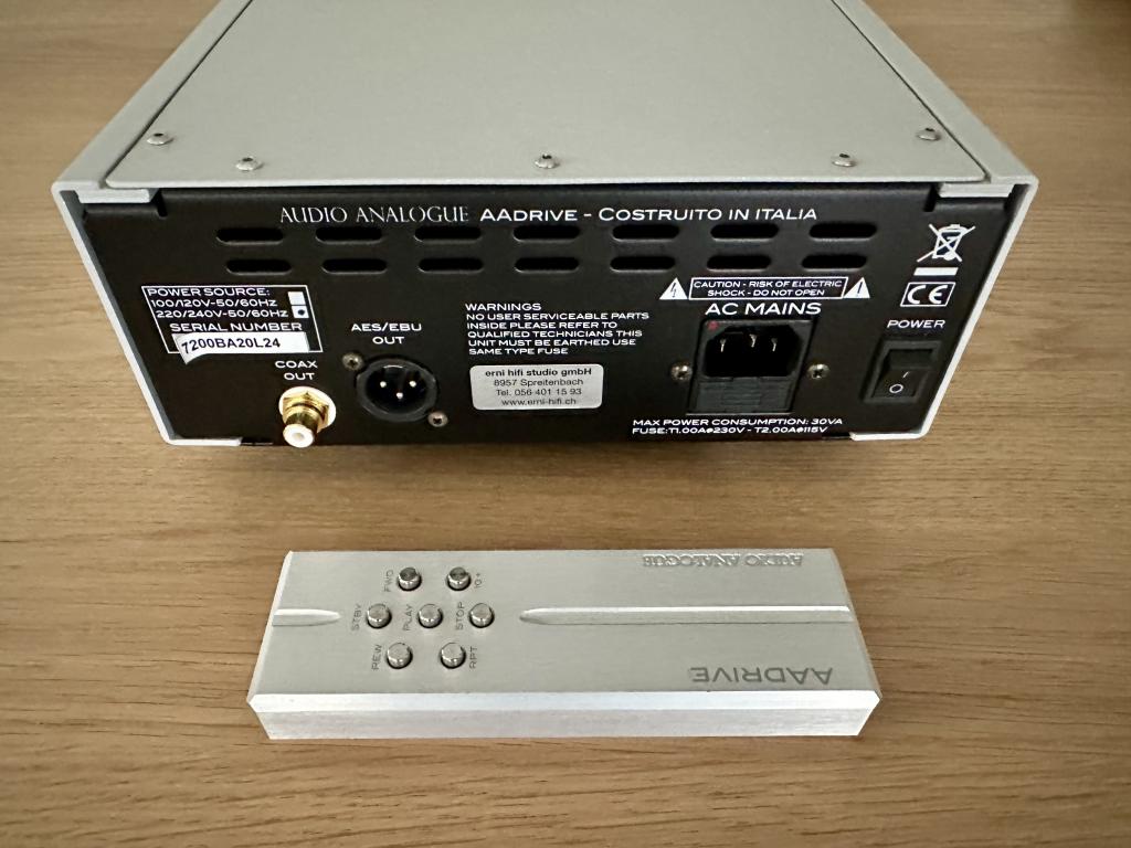 Verkaufe neuwertigen Audio Analogue AADRIVE, inkl. OVP und Stromkabel, silber, wie neu, CH Gerät, Kauf 2022. Aus der Presse: Der Audio Analogue AADRIVE ist ein reiner CD-Transport auf höchstem technischen Niveau. Technische Daten Laufwerk: CD-Pro2LF – eines der weltweit renommiertesten Profi-Laufwerke; Ausgänge: AES/EBU, koaxial (S/PDIF), optisch (TOSLINK); Gehäuse: massives Aluminiumgehäuse mit vibrationsdämpfender Konstruktion; Stromversorgung: großzügig dimensioniertes Linearnetzteil mit selektierten Bauteilen; Display: dimmbar, mit hochwertiger Punktmatrix-Anzeige; Fernbedienung; Maße (B x H x T): 450 x 120 x 390 mm; 13; Farbe: Silber. Versand oder Übergabe in Deutschland oder Schweiz. Keinerlei Garantie oder Gewährleistung, Rücknahme ausgeschlossen.