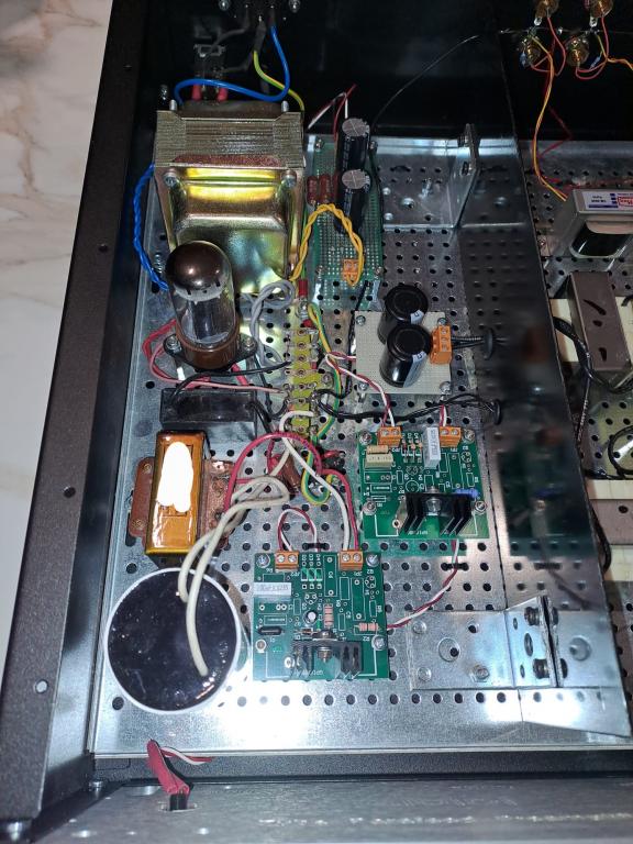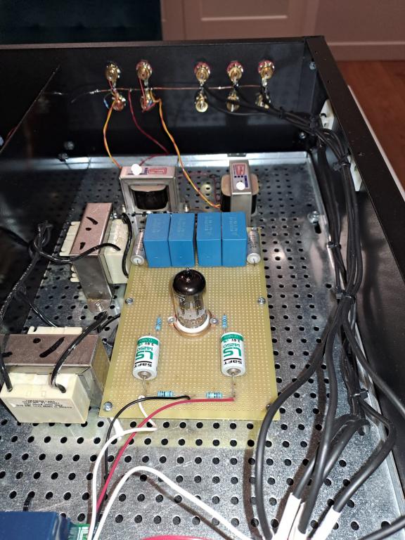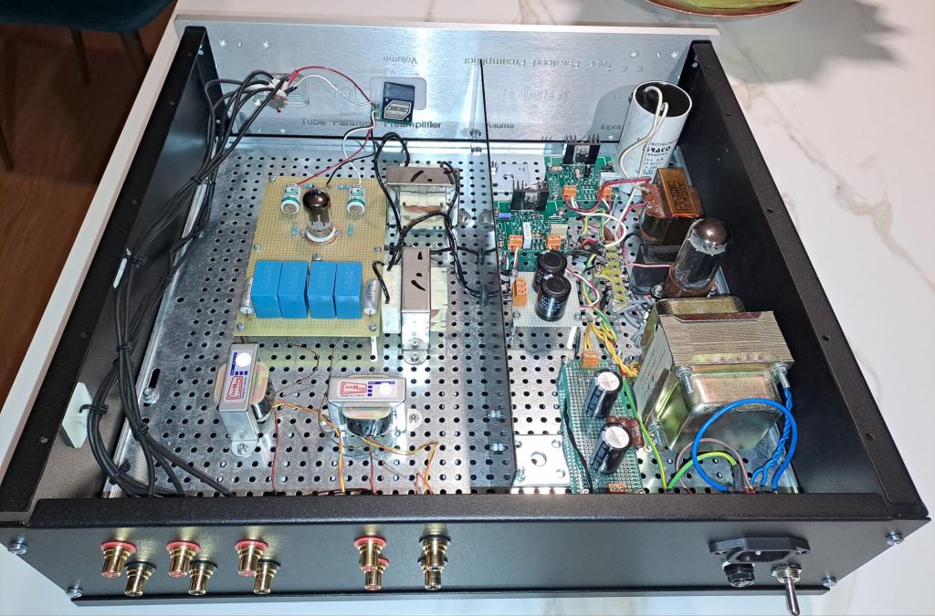 I am offering for sale a tube line preamplifier with permalloy output transformers. This preamp use a parafeed transformer configuration. The preamplifier has been meticulously designed and manufactured. This preamplifier comes from some demonstrations. It's the first one. The power supply is truly state-of-the-art. The anode voltage is rectified using a high-quality Sylvania Gold Brand 5y3gt tube with black plates. This is followed by a CLC filter with high-quality components (polypropylene capacitors and a vintage inductor). After the first inductive stage, two circuits are added to further filter and stabilize the DC voltage. The signal circuit is designed around 5687/e182cc high quality double triodes. You can use both the tubes. The tube is biased with a lithium battery, while the anode load is made with a very high-quality anode inductor. The circuit follows with polypropylene capacitors and a parafeed output transformer manufactured by Cinemag with a very high-quality permalloy (nickel/mumetal) core. The gain stage is free of any type of feedback. To be clear, the design is similar to the Zanden 3000 MKII preamplifier, but with better quality. For example, this preamplifier uses very high-quality anode load inductors, unlike the Zanden, which uses an active load made with MOSFETs. The preamplifier's sonic qualities are exceptional: transparency, detail, three-dimensional soundstage reconstruction, and natural timbre are its hallmarks. A truly state-of-the-art device. I can share the preamplifier measures.