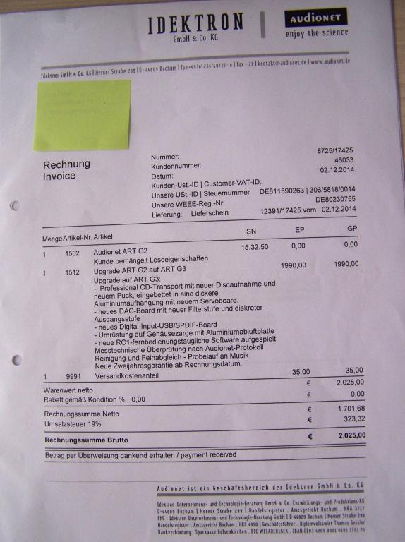 Ursprünglich war der Player ein ART G2, welcher von Audionet selbst 2014 auf einen ART G3 umgebaut wurde. Die Rechnung dafür liegt vor, der Umbau allein kostete 2025€!