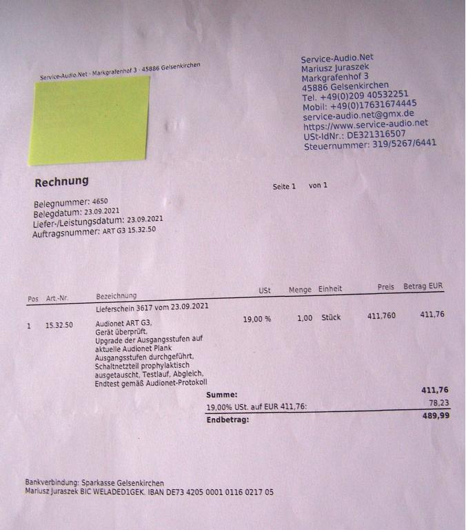 • Rechnung von 2021 über die nochmalige Aufwertung und Prüfung von der Audionet Werkstatt