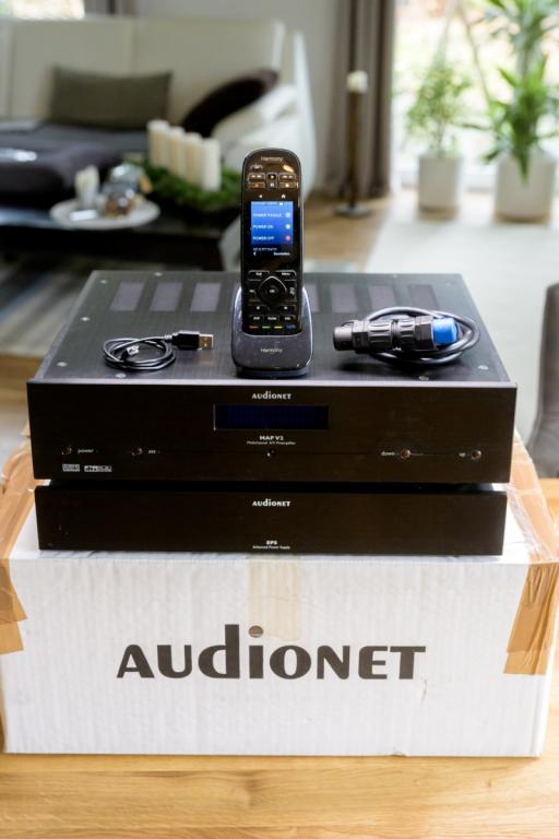 Obendrauf und sehr selten die passende Logitech Harmony Fernbedienung mit einprogrammierten Audionet-FernbedienungsCodes.