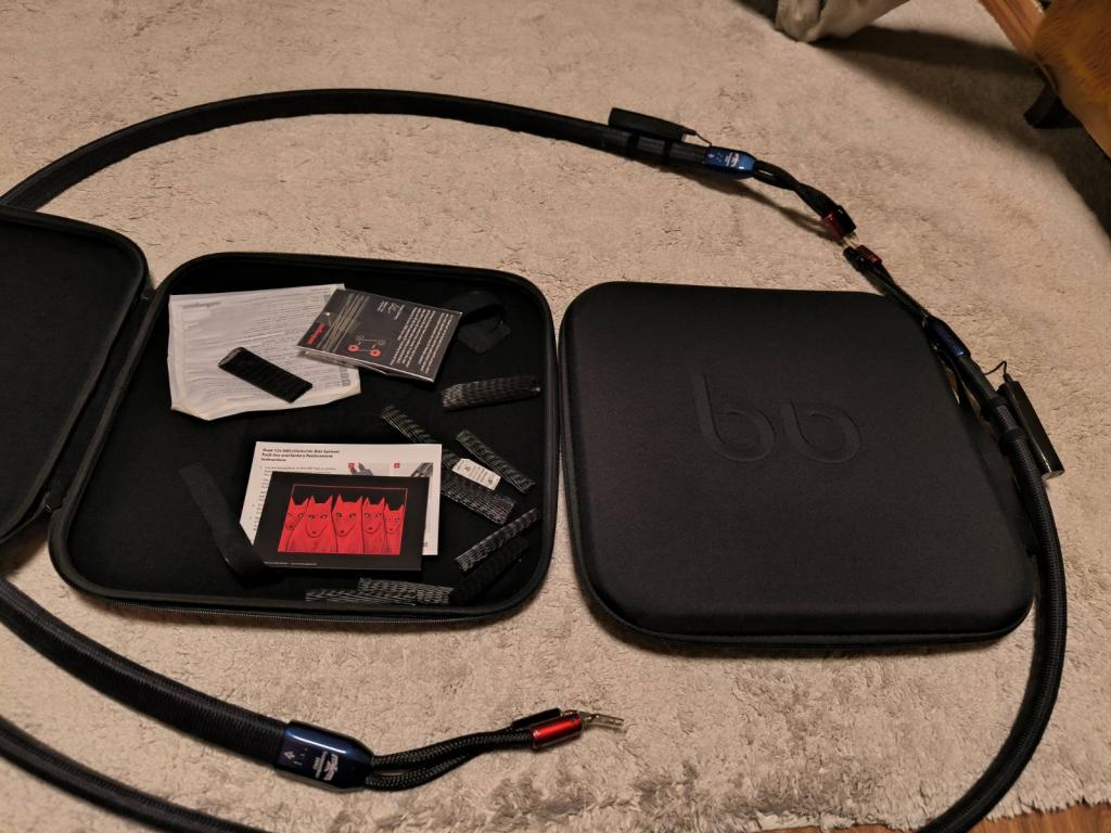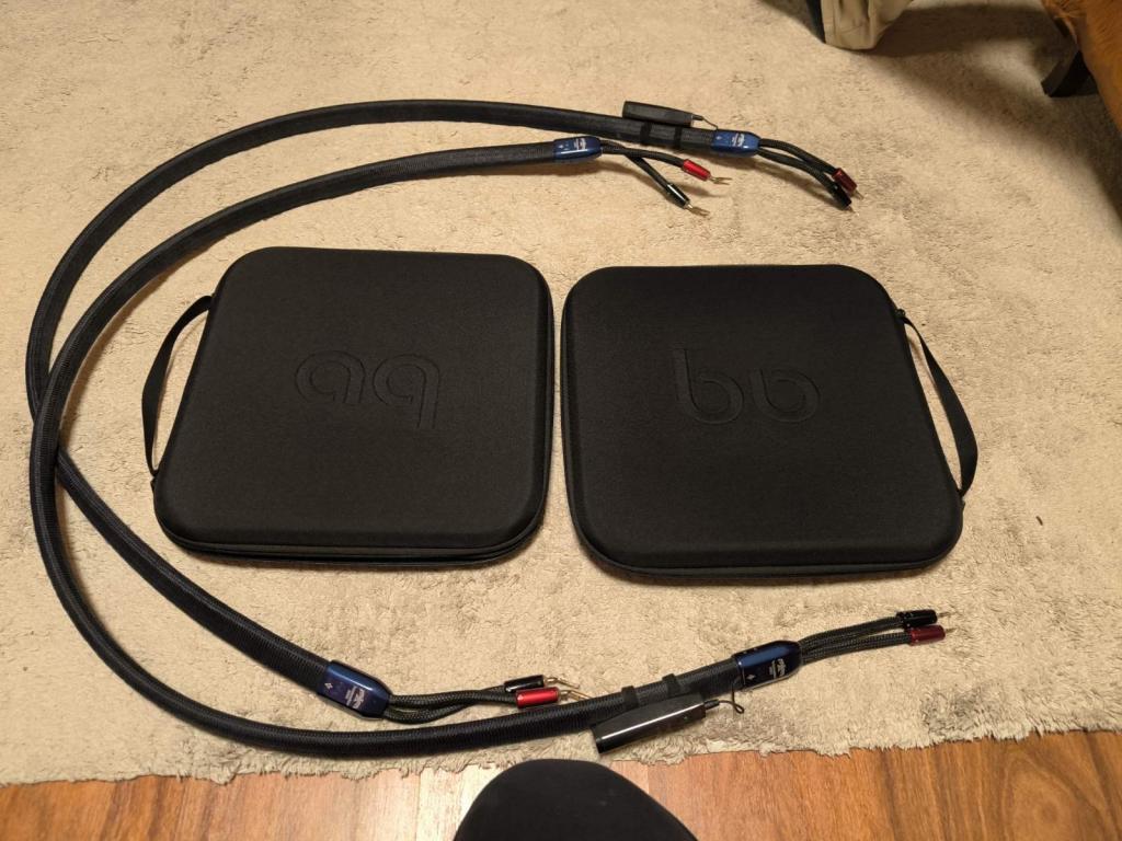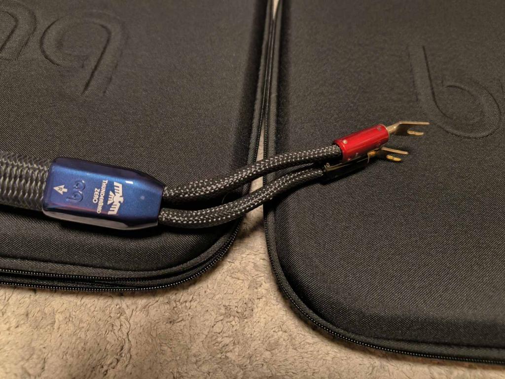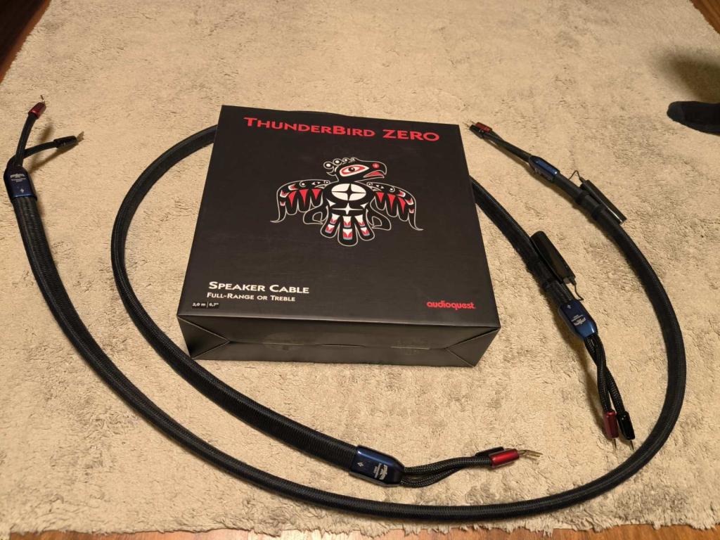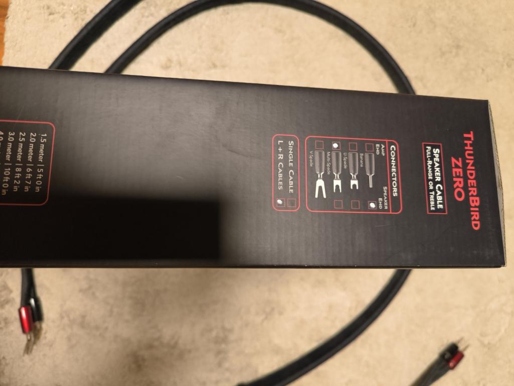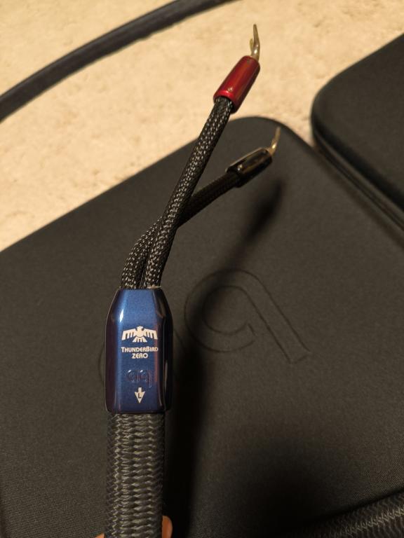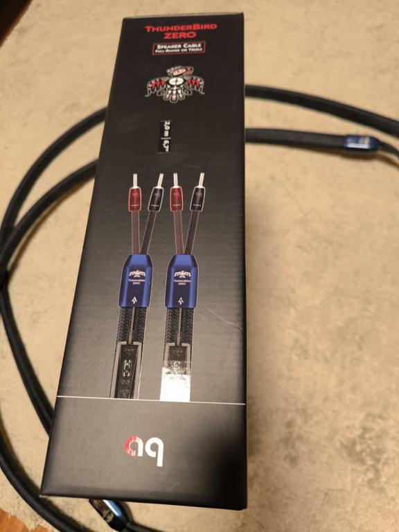 Selling an Audioquest Thunderbird Zero speaker cable, length 2 m, with spade connectors on the amplifier side and banana plugs on the speaker side. Condition like new, all factory accessories included.
