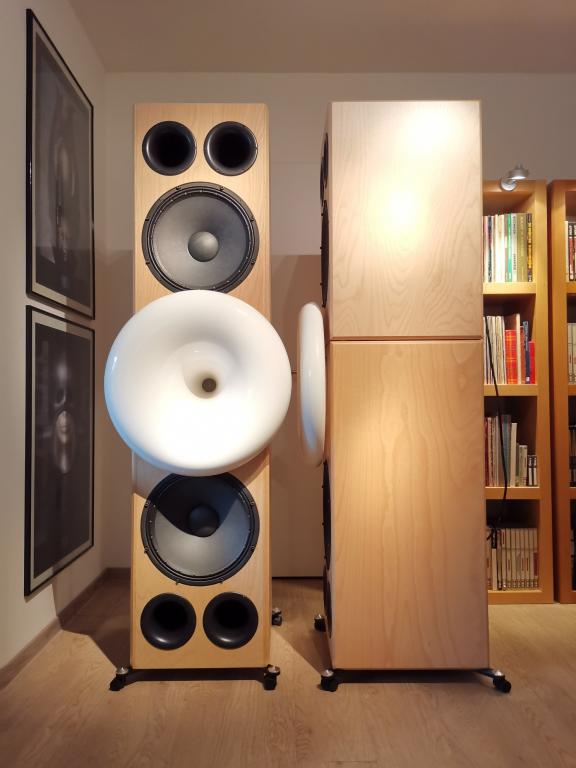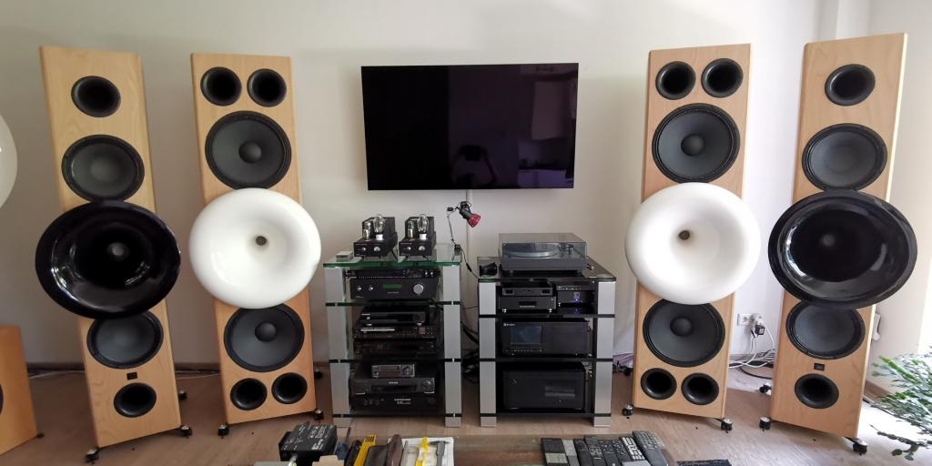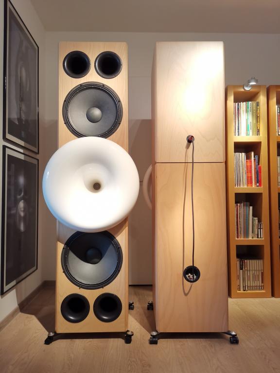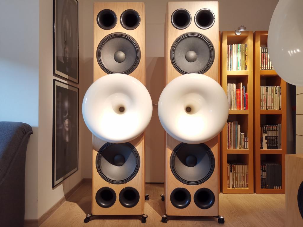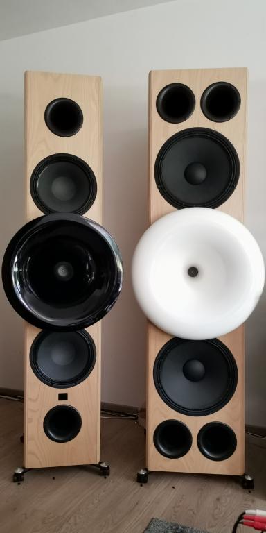 Die 60cm großen Kugelwellenhörner bestehen aus einem sehr starken, schweren und resonanzarmen Glasfasergemisch, klingen äußerst dynamisch bei extrem hoher Auflösung!