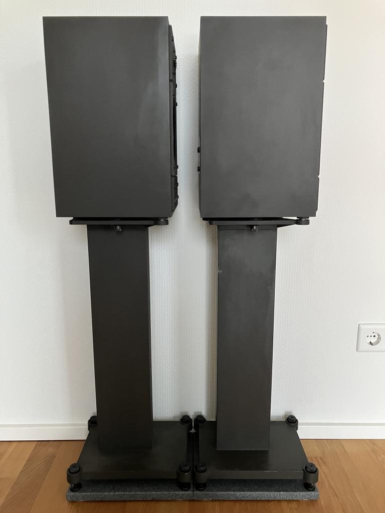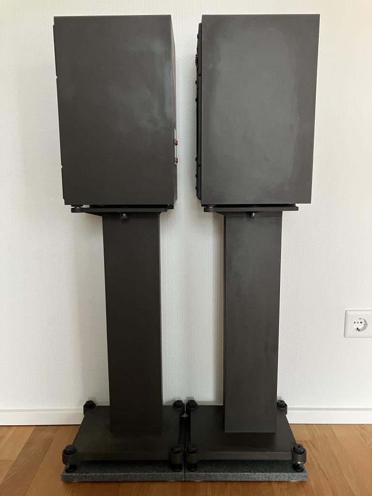 Die Spikes, Kontermuttern und die Schrauben zur Fixierung der Gehäuse auf den Stands sind vollständig vorhanden, ebenso die originalen bi-wiring Brücken.