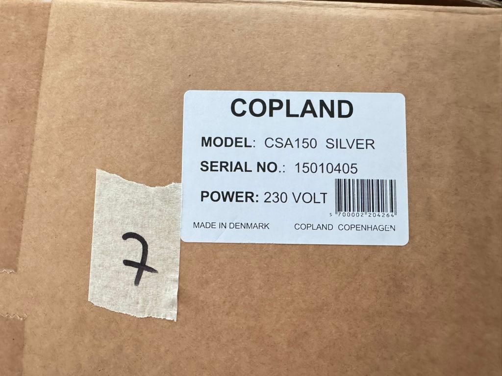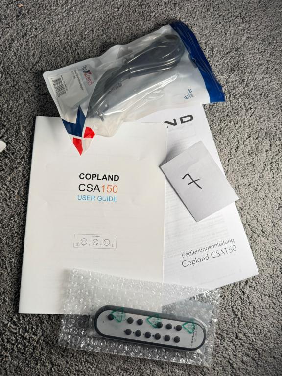 Included in delivery: Copland CSA-150, power cord, remote control, manual, and original packaging.
