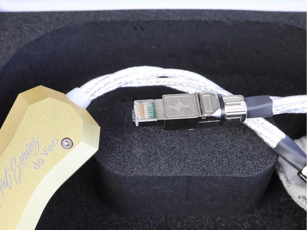 Da Vinci Network uses the very newest generation of 'mono-crystal' conductors. Crystal Cable call this Infinite Crystal Silver (ICS). Each conductor in the cable consists of one long 'crystal' of their proprietary silver/gold metal, thereby improving conductivity and reducing signal smearing. Unlike the Crystal Cable Diamond and Monet network cables, the Da Vinci Network offers a data rate of 1,000Mbit/s, or 1 Gigabit.