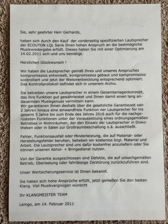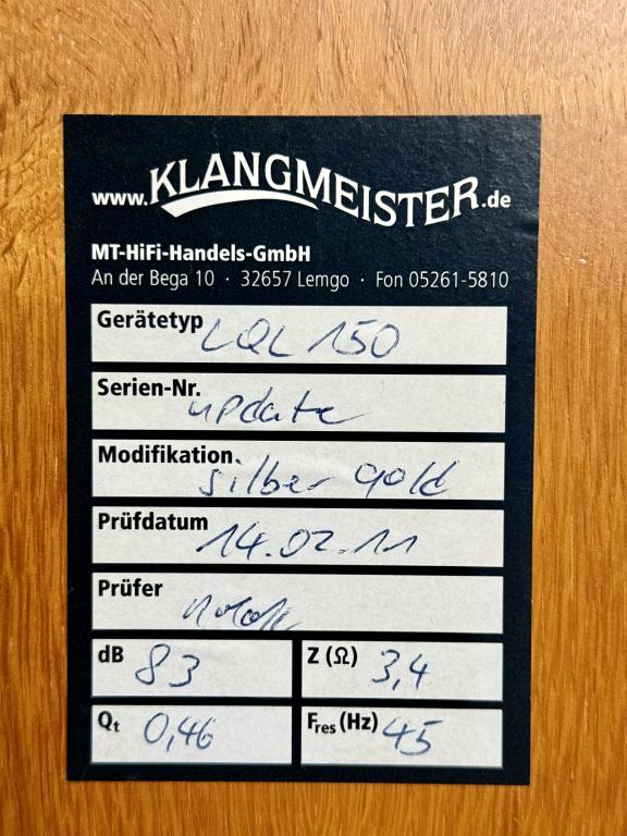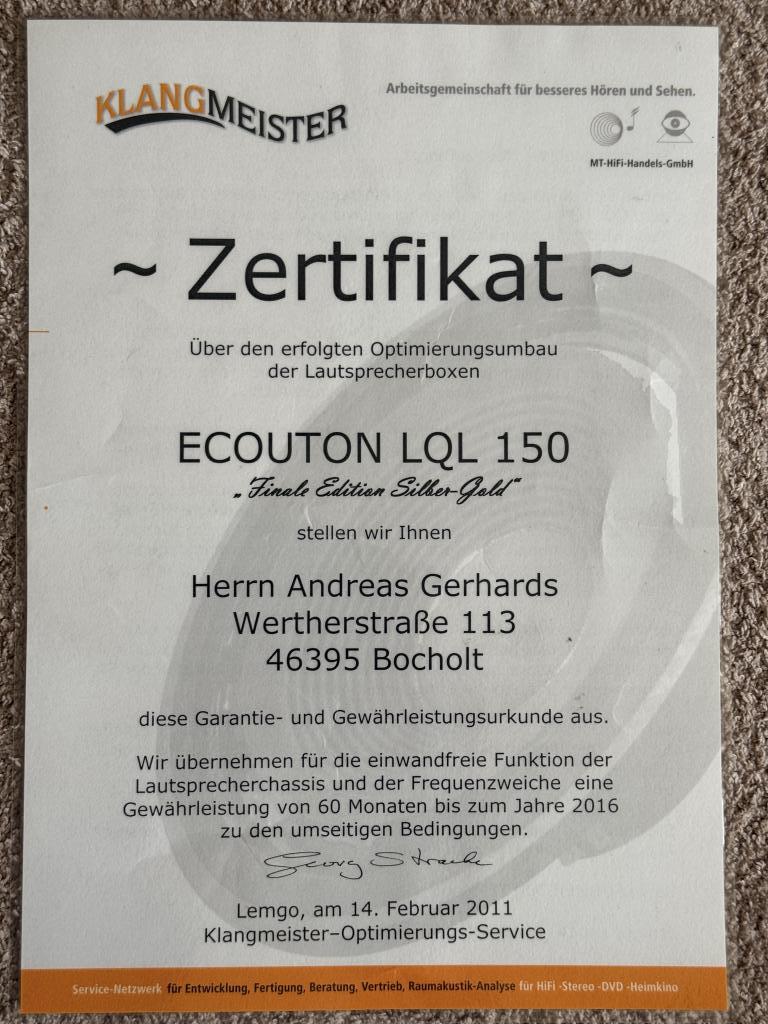 Ich verkaufe ein Paar Ecouton LQL 150 Transmissionline im der finalen Silber Gold Edition (mit Zertifikat von Georg Stracke, Klangmeister, Lemgo).