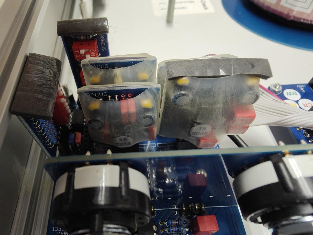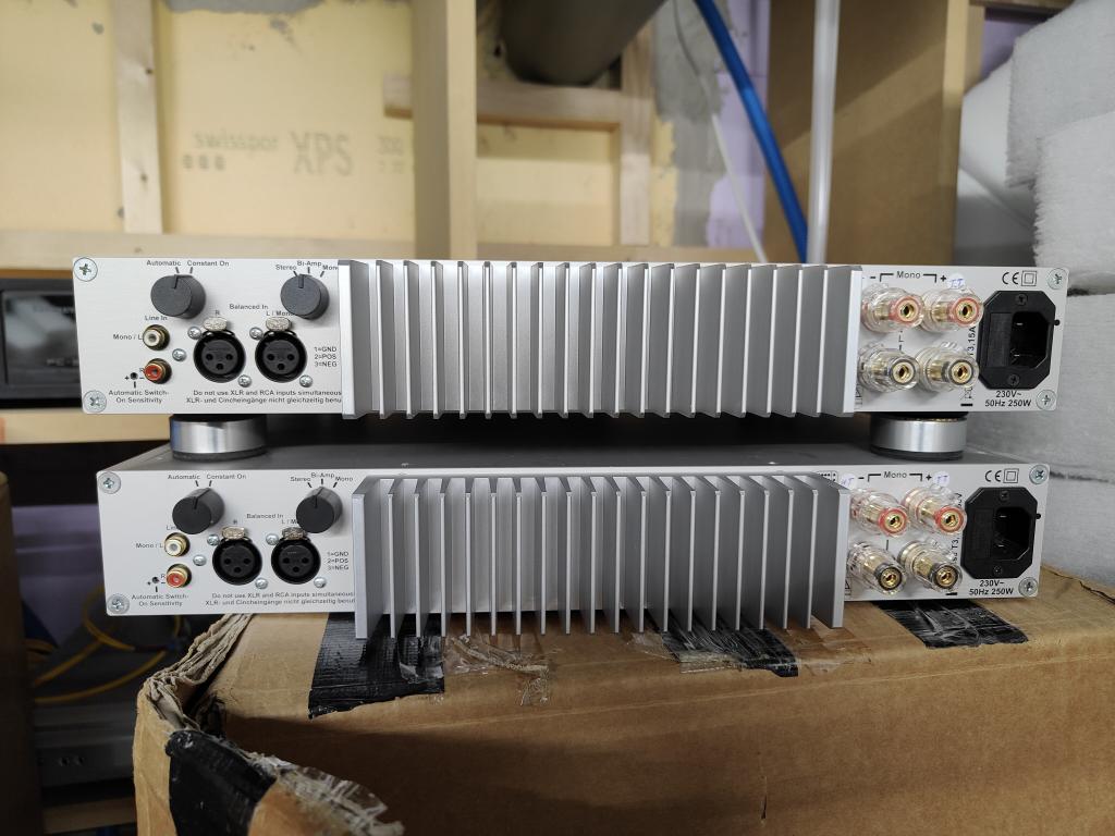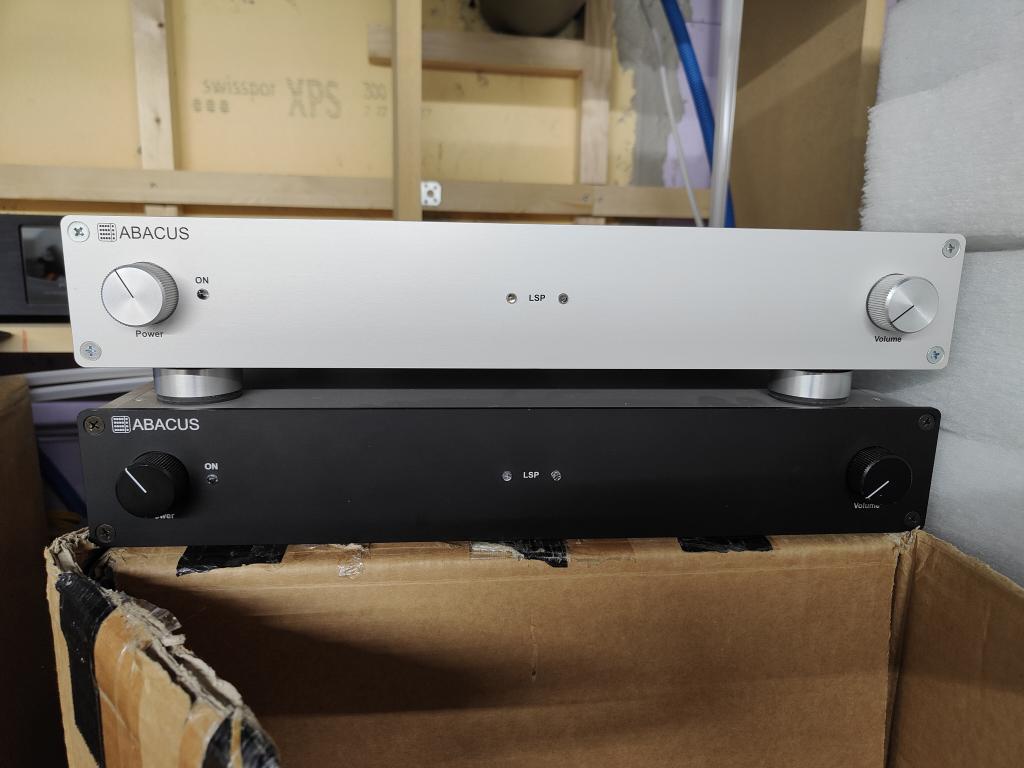Die Verstärker können mit den integrierten Alps-Potentiometern auch als Vorverstärker verwendet werden. Aktuell werden sie als reine Endstufen mit fester Verstärkung eingesetzt. Eine hat eine schwarze und die andere eine silberne Frontplatte. Der mit der silbernen Frontplatte steht auf bFly Master Füssen.