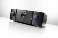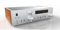 Die ikonische, retro-inspirierte Frontplatte aus gefrästem Aluminium sticht dabei sofort ins Auge. Darauf: exklusive, haptisch sehr ansprechende Regler für Lautstärke, Balance und Eingangswahl sowie Schalter für Betrieb, Mute, Direct, MC/MM Phono und Dirac Live-Raumkalibrierung. Ebenso direkt am Frontpanel untergebracht sind ein 3,5 mm AUX-Eingang und ein 3,5 mm Kopfhörerausgang. Das Display ist zweizeilig und in orange gehalten. Der Look wird komplettiert durch klassische Seitenwände aus Teakholzfurnier.