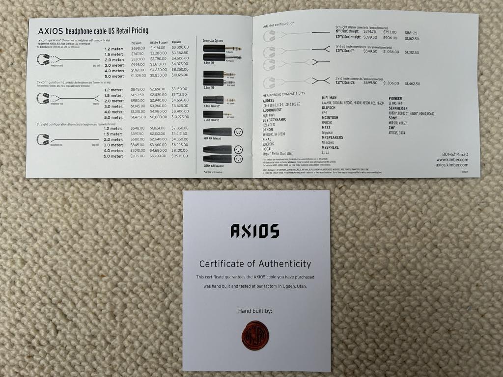 Der vollständige Lieferumfang beinhaltet das Kabel, die Original-Verpackung, einen Kimber Stoffbeutel, ein Echtheitszertifikat, ein Prospekt, eine Produktinfokarte sowie den Original-Umschlag für die Unterlagen mit einem Axios Siegel von Kimber.