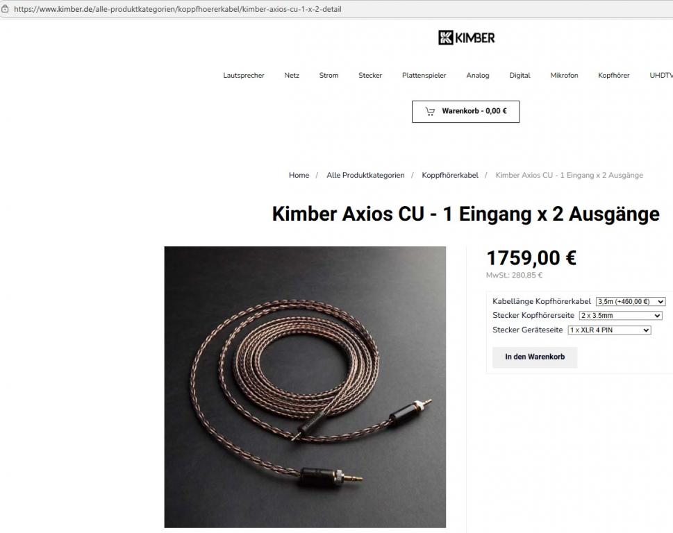 Der Vollständigkeit halber mein Verkaufsgrund: ich verkaufe das Kabel wegen des Umstiegs auf eine elektrostatische High End Kopfhörer- / Verstärker-Kombination. Die Qualität des Kabels ist nicht mein Grund für den Verkauf. Ich schätze das Axios CU sehr, es ist das beste Kopfhörerkabel, das ich bisher gehört und benutzt habe: es klingt sehr gut, ist sehr gut verarbeitet, ist ergonomisch, bietet eine angenehme Anfassqualität, es ist nicht mikrofonisch und es sieht sehr wertig und elegant aus – insbesondere auch die holzummantelten Stecker mit dem eingravierten Kimber-Logo.