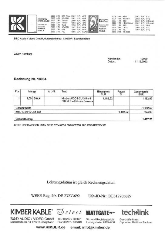 Exzellenter Zustand ohne Macken oder funktionelle Mängel. Das Kabel wurde von mir selbst in meinem tierfreien Nichtraucherhaushalt genutzt. Ich habe das Kabel im Dezember 2023 als Neuware von dem Vertrieb für Kimber in Deutschland erworben. Die Rechnung ist vorhanden. Der aktuelle Listenpreis beträgt 1.759 Euro.