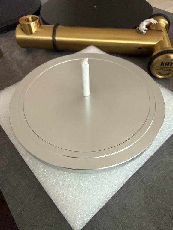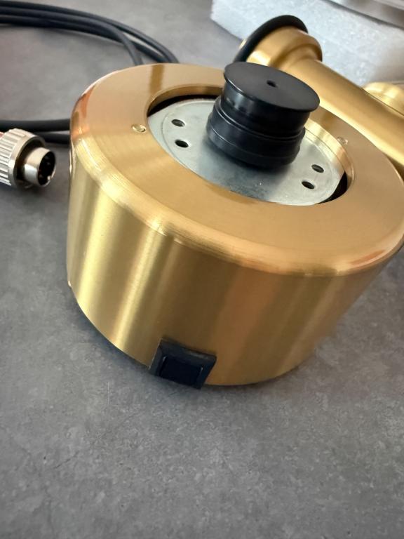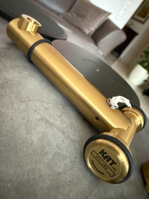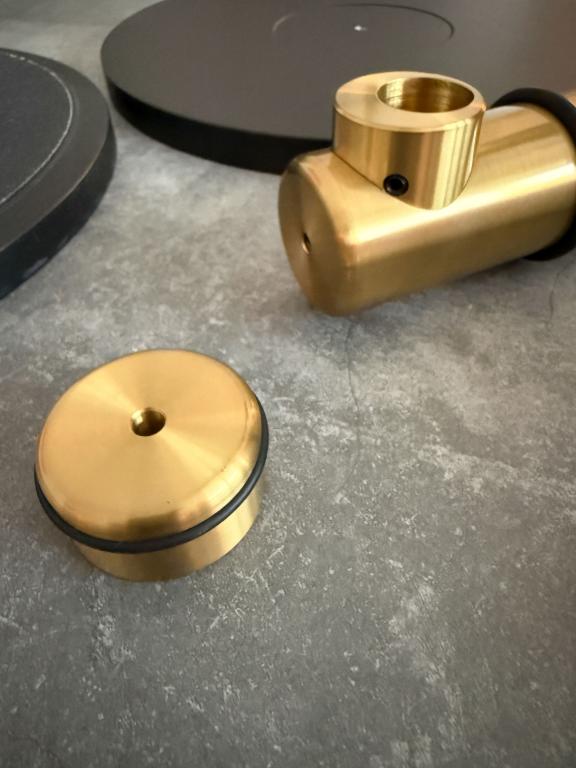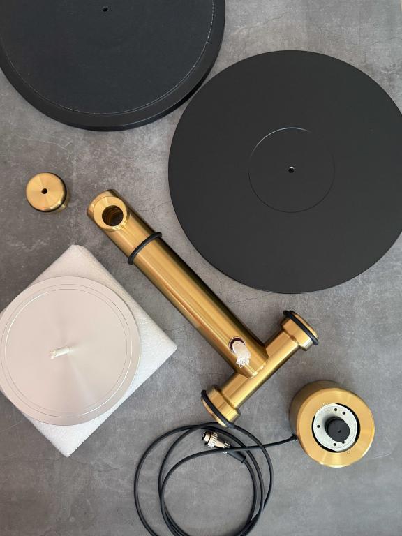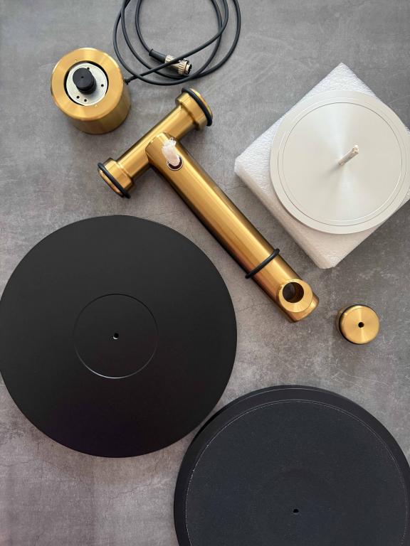 Das Laufwerk besteht aus massiven Messingstangen (Ø 50 mm), die eine extrem steife Verbindung zwischen Plattenteller, Lager und Tonarmbasis schaffen. Es gibt keine flache Grundplatte – die T-förmige Struktur sorgt für maximale Stabilität und Resonanzfreiheit.