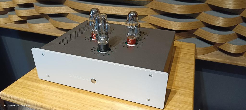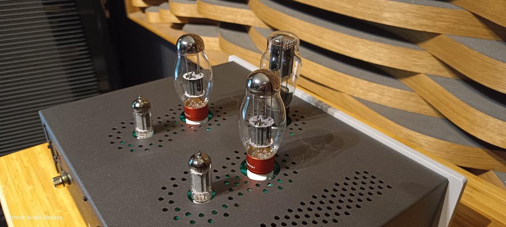 - Vollständig mit Röhren bestückt, direkt geheizte Doppeldioden-Gleichrichtung, CLC-gefilterte Anodenstromversorgung