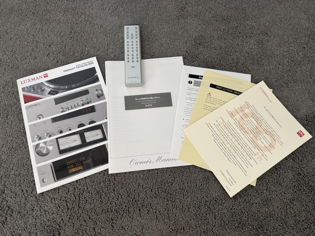 Im Lieferumfang enthalten ist: Luxman D-07X Centennial, Netzkabel, Fernbedienung und die originale Verpackung.