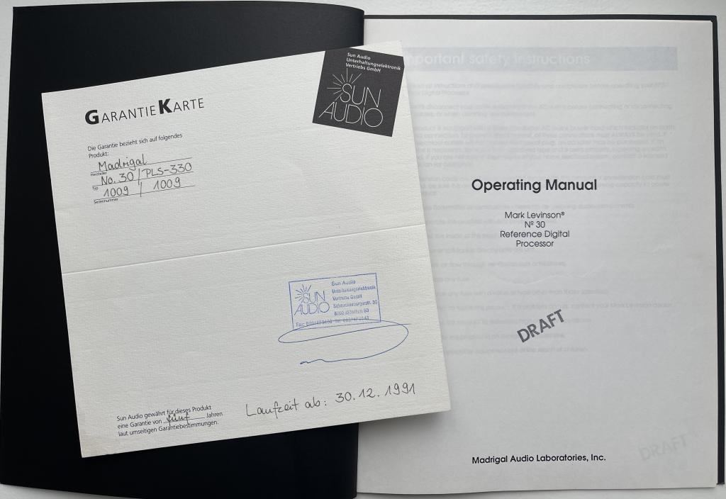 Mark Levinson No.30 DAC including power supply unit. This is first edition with Ultraanalog chipsets on board. DAC and PLS have same serial numbers. I’m second owner. DAC originally purchased in Germany and have Europe AC settings. Unit was seldom use within last 10 years and still in perfect condition and full working order. It sounds fantastic. Minor marks of use on corners. I would give 8 or 9 from 10. Keep in mind it is more than 30 years old.