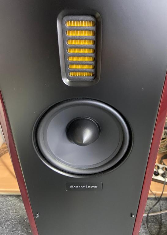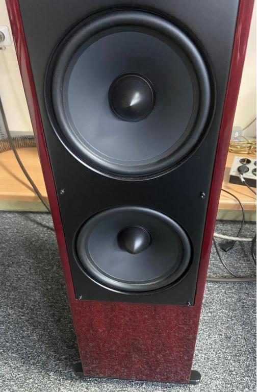 Zwei 20,3 cm (8 Zoll) Aluminiumkegel mit Aluminiumgusskorb. Nichtresonantes asymmetrisches Kammerformat. Starre strukturierte Staubkappe zum Reduzieren der Kegelaufbruchmodi.