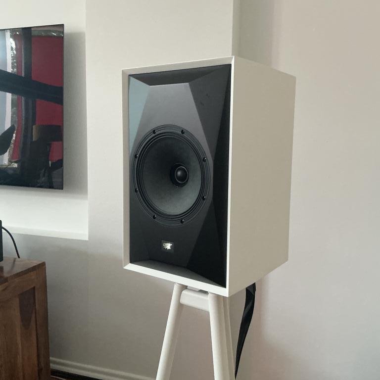 MoFi Sourcepoint 8 mit Art & Voice Weichentuning in der Farbe Weiß sowie Lautsprecherständer von Solidsteel.