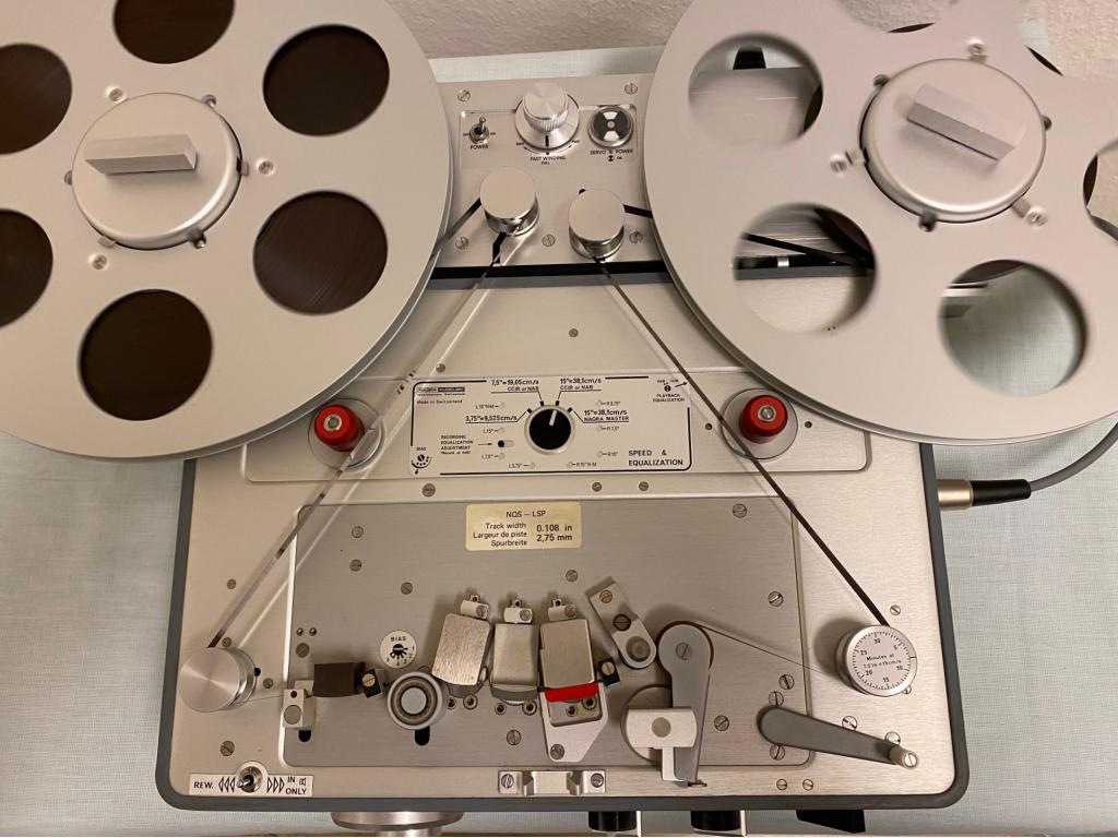 Um mit ihr auch große 26,5er Spulen abspielen zu können, wurde ihr hier im Labor ein unter Verwendung von Nagra-Teilen gebauter Großspulenadapter mit zwei Motoren und elektrischer Regelung zur Seite gestellt.