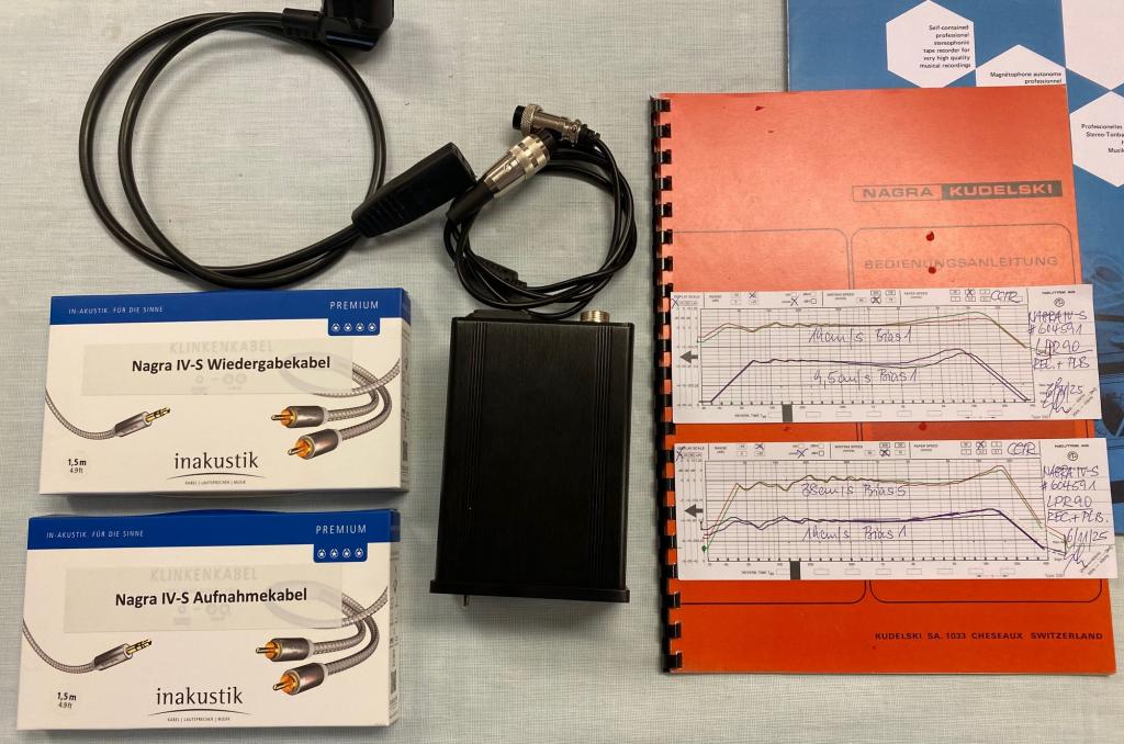 Es gehören der Großspulenadapter, ein für Kondensatormikrofone konzipiertes hochwertiges Labor-Netzteil, ein spezieller Kabelsatz für Aufnahme und Wiedergabe in Premium-Qualität (Amphenol Klein-Tuchel auf Cinch), die Ledertasche mit Tragriemen, die Messprotokolle des Neutrik Audiographen, die deutsche Bedienungsanleitung, der Geräteprospekt und eine neue 13er Leerspule zum Angebot.