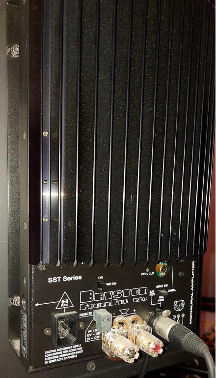 3 × Bryston PowerPac 300 Monoblöcke (jeweils 300 W RMS an 8 Ohm)
