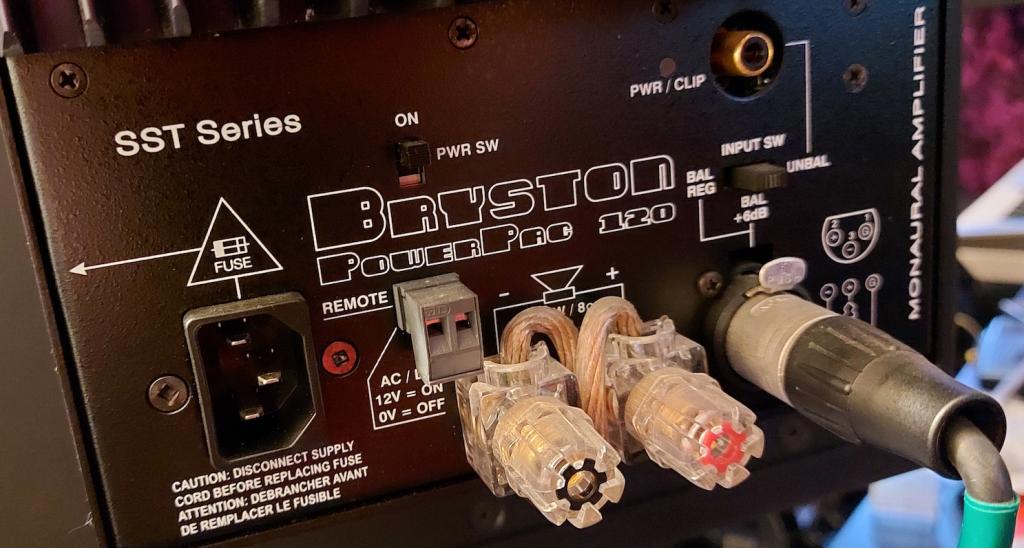 2 × Bryston PowerPac 120 Monoblöcke (jeweils 120 W RMS an 8 Ohm)