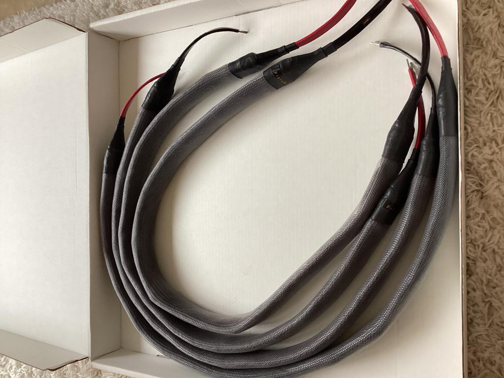 These cables are handmade out of pure silver. Pure silver coils constructed by hand in the USA. Fantastic cables. Truly high-end reference speaker cables.