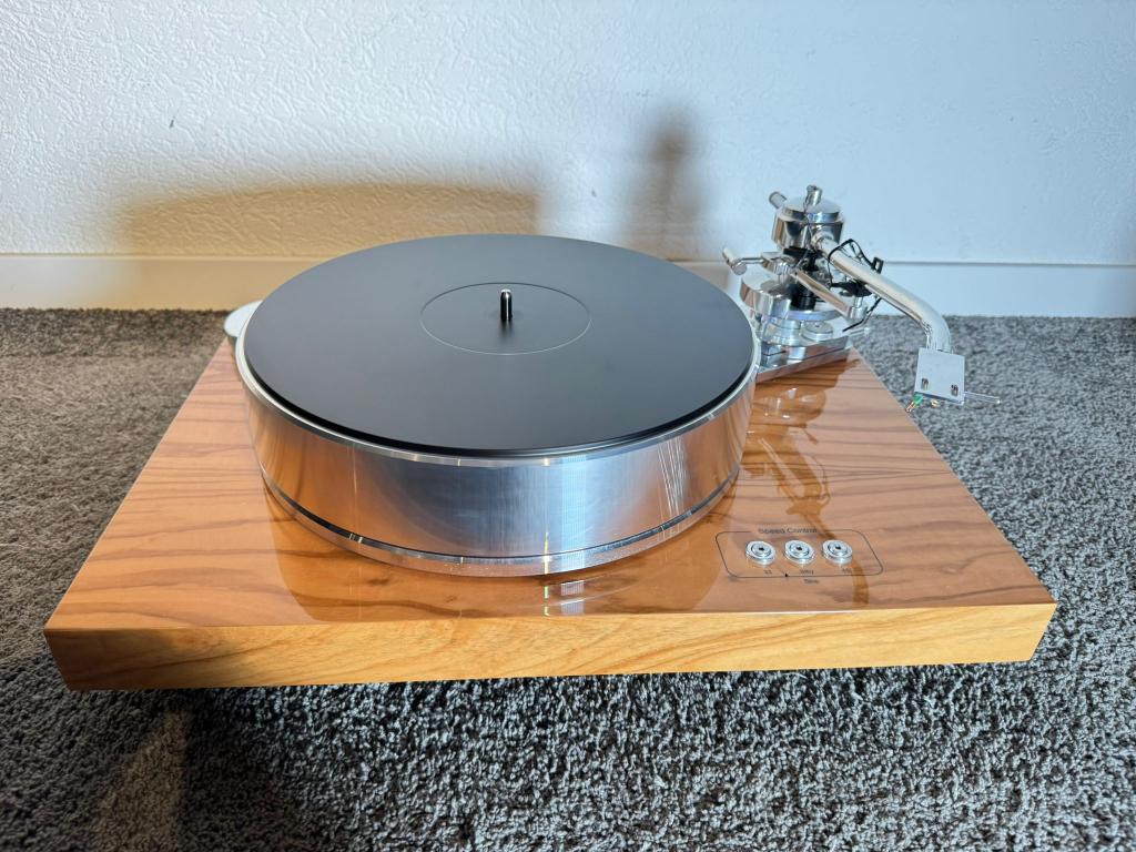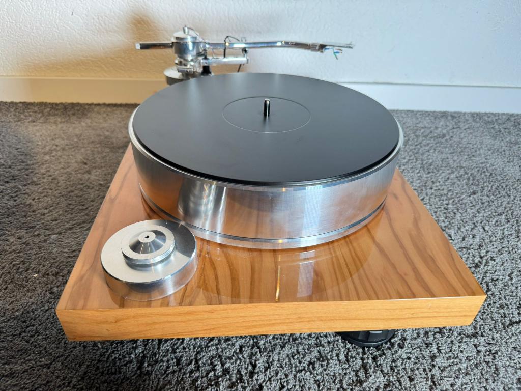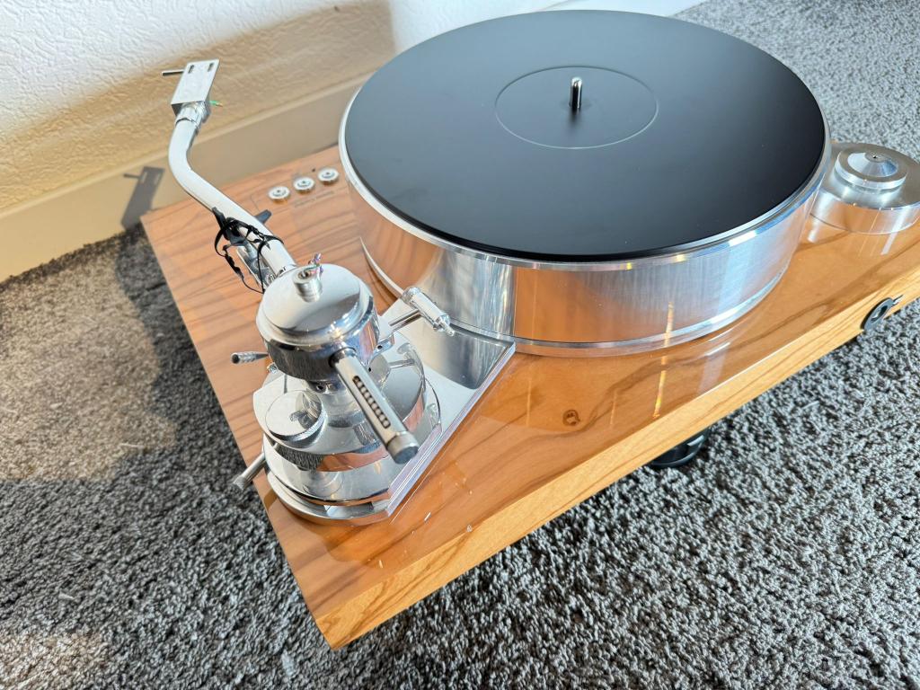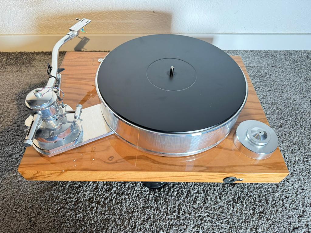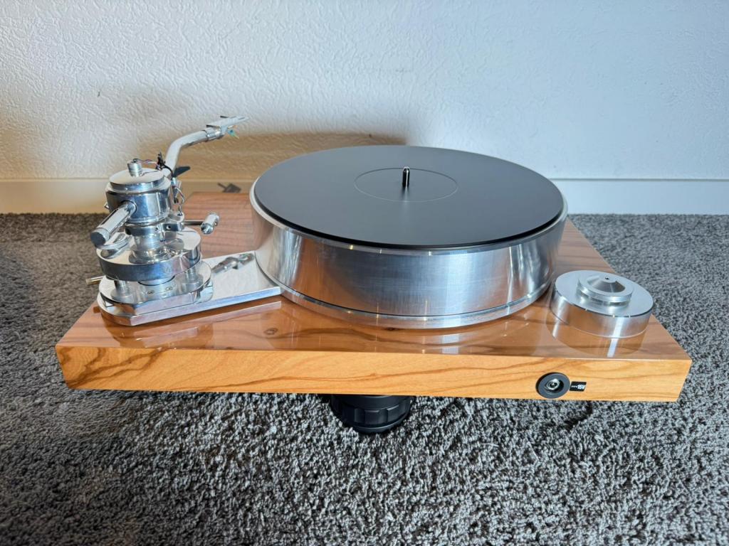 Here we sell a mint condition Pro-Ject Signature 10 turntable with original tonearm in olive.