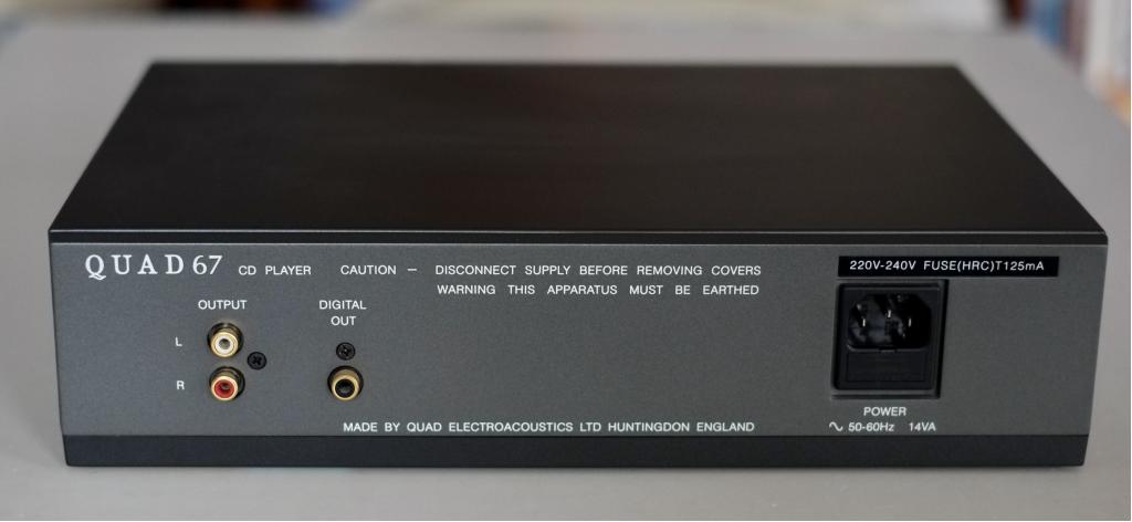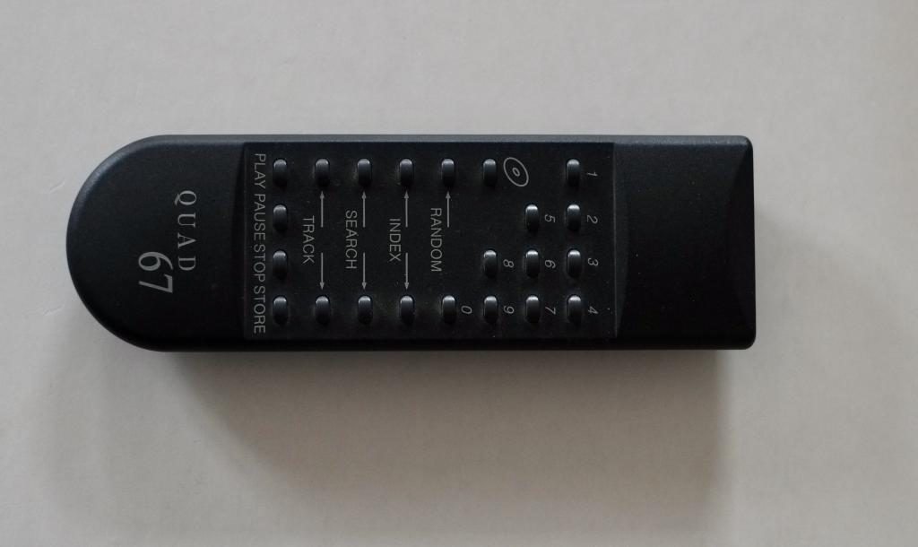 Im "Inneren" handelt es sich beim CD 67 jedoch um ein komplett anderes Gerät, welches nur wenig mit dem Vorgänger gemein hat: Auch beim CD 67 handelt es sich um ein Philips-Konzept, als Laufwerk findet sich ein CDM 9 (allerdings nicht die "Professional" Version mit Glaslinse---), Servo und Decoder stammen ebenfalls aus dem Philips-Lager. Bei der grossen Platine, die im Wesentlichen Display und Wandler, sowie die analoge Ausgangsstufe beherbergt, dürfte es sich aller Wahrscheinlichkeit nach um eine Eigenentwicklung von QUAD handeln. Womit wir beim zweiten entscheidenden Unterschied zum Vorgängermodell angelangt wären: Der CD 67 wandelt mit einen D/A-Wandler von Crystal, es handelt sich dabei um einen Delta/Sigma Wandler mit 18 Bit Auflösung Typ CS 4328 KP. Gegenüber dem eher "hausbackenen" TDA 1541 des Vorgängermodells handelt es sich dabei um einen echten Fortschritt (womit keine klangliche Bewertung abgegeben werden soll). In der Ausgangsstufe finden sich "schnelle" JFET-Operationsverstärker von Burr-Brown - auch diese Stufe war im CD 66 eher einfach aufgebaut (wobei man natürlich auch den Bauteilefortschritt im Verlauf der Jahre berücksichtigen muss). Auch der CD-67 verfügt über einen koaxialen Digitalausgang.