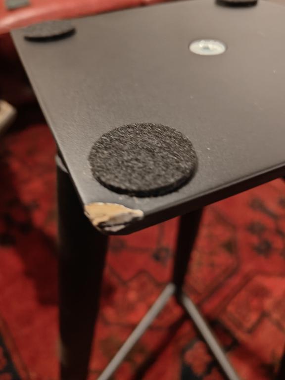 Die Lautsprecher funktionieren einwandfrei. Leider haben der rechte Lautsprecher und der dazugehörige Ständer durch ein Missgeschick etwas Schaden genommen und eine Ecke ist beschädigt (siehe Bilder). Diese Ecke ist jedoch hinten, sodass es von vorne nicht ersichtlich ist. Aufgrund der Beschädigung muss der Preis natürlich reduziert werden, aber bitte seht von unrealistischen Angeboten ab.