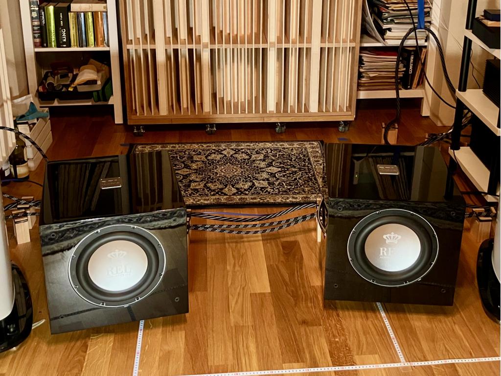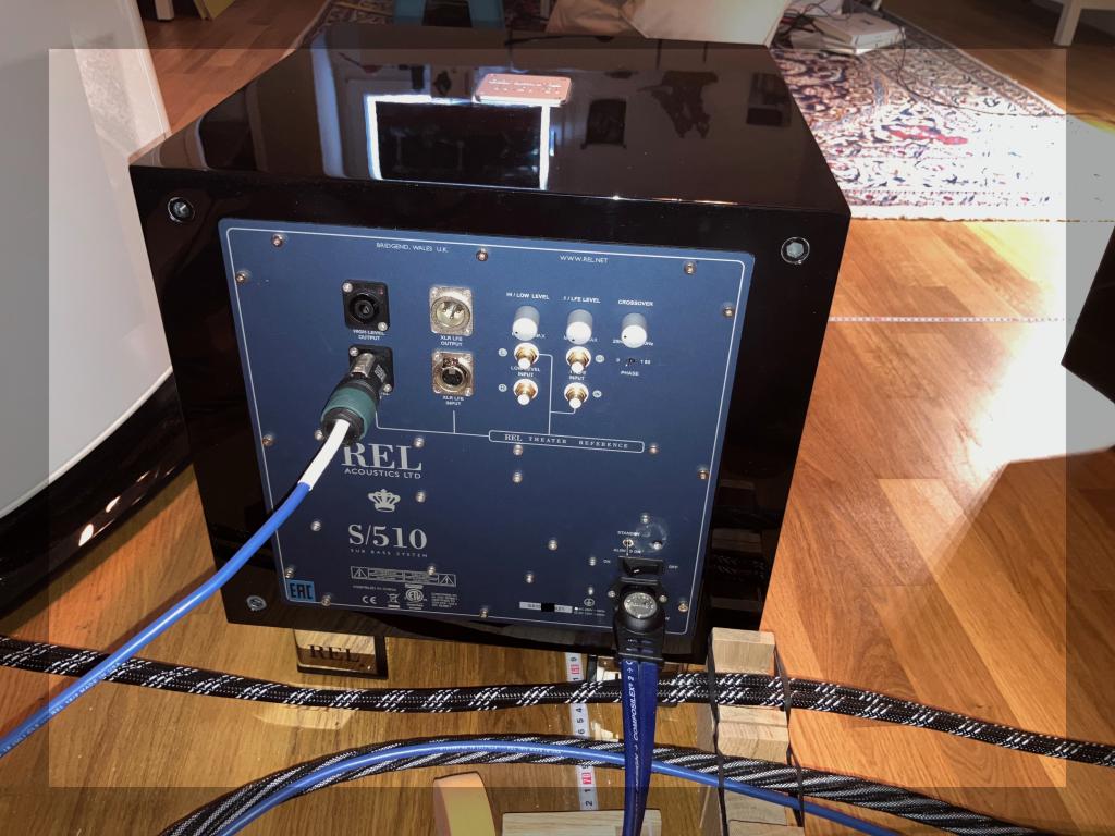 REL Acoustics 2× REL S/510 Subwoofer Piano Black — sehr guter Zustand + 2× REL Bassline Blue Sonderkabel