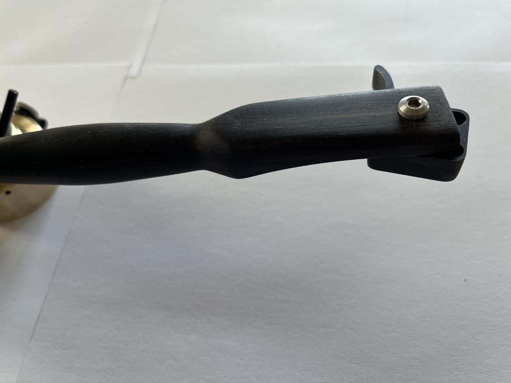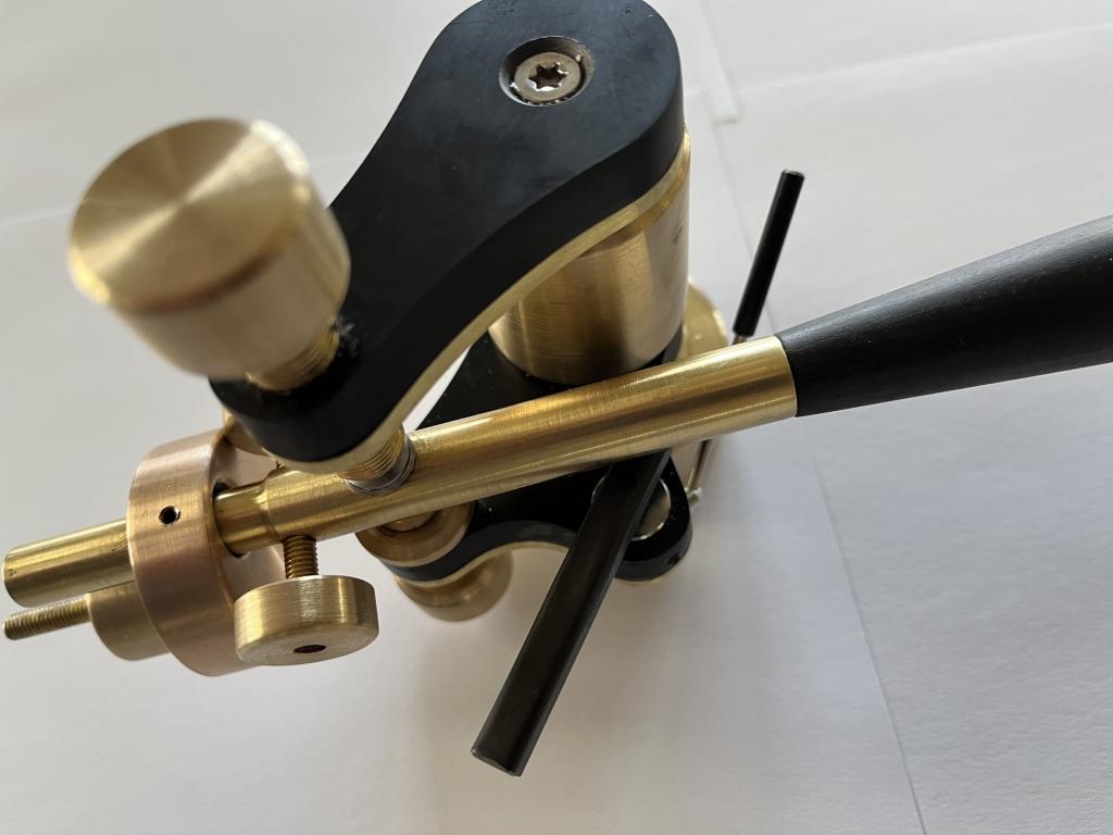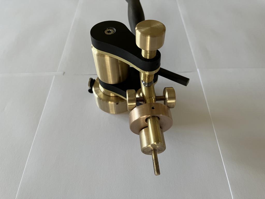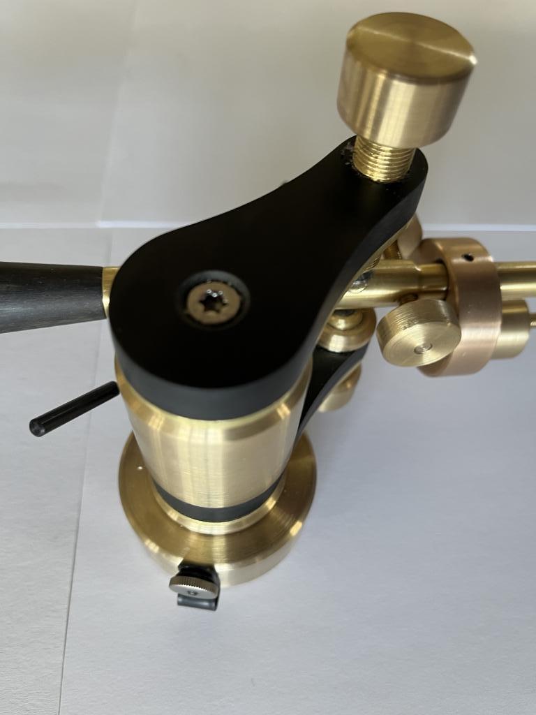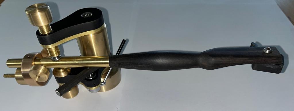 Neuer Fuchs Tonarm in sehr edler Ausführung. Die Metallteile bestehen aus Messing bzw. Bronze, das Armrohr aus Ebenholz, die Trägerplatten und das Headshell-Plättchen aus einem speziellen hochdichten Material auf Holzbasis.