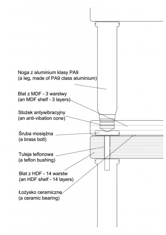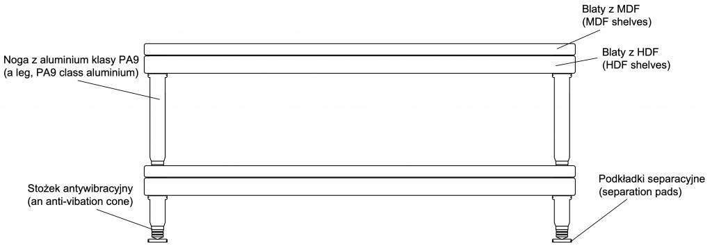 Materiał of shelf: upper and bottom level: MDF 1 x 30 mm, HDF 1 x 46 mm, thickness of shelves: 2 x 30 mm (up), 46 mm (down).