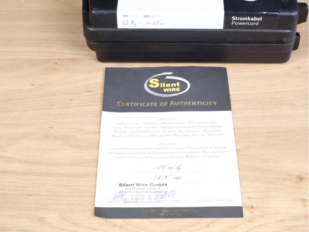 One Silent Wire AC-33 Ag silver audio power cable in a very good condition. AC-33 Ag plays music powerfully, offers an exemplary sharp spatial orientation and draws finest high-frequency patterns. It produces a forceful bass and presents a broad and deep sound stage.
