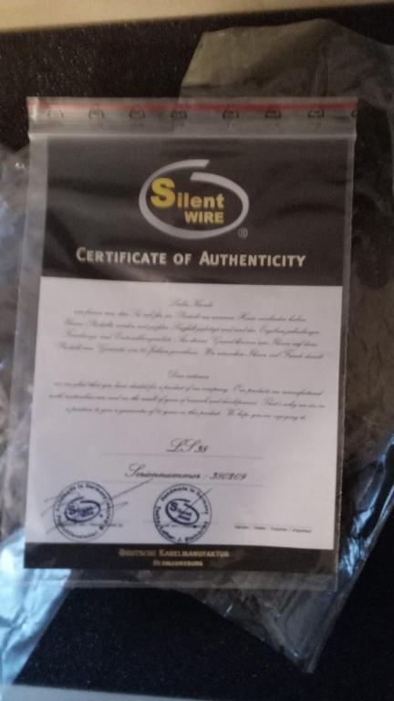 Verkaufe ein neuwertiges Paar LS 38 Kabel von Silent Wire. Es handelt sich nicht um die neueste Kupfer Version siehe auch das abgebildete Originalzertifikat.