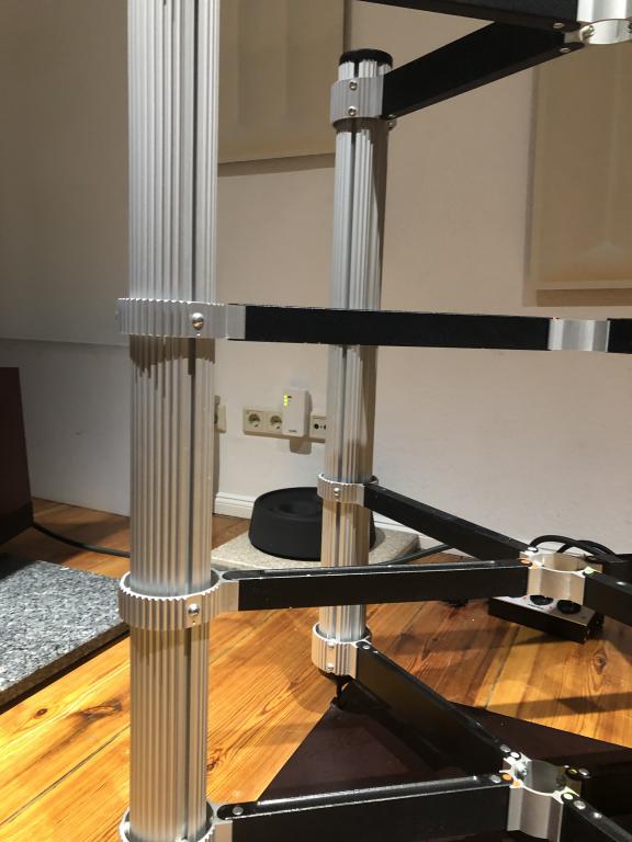 Dadurch wird jede Ebene mechanisch in der X- und Y-Achse entkoppelt, was Schwingungen und Resonanzen wirkungsvoll minimiert – ideal für empfindliche Hi-Fi-Komponenten wie Vorverstärker, DACs oder Plattenspieler.