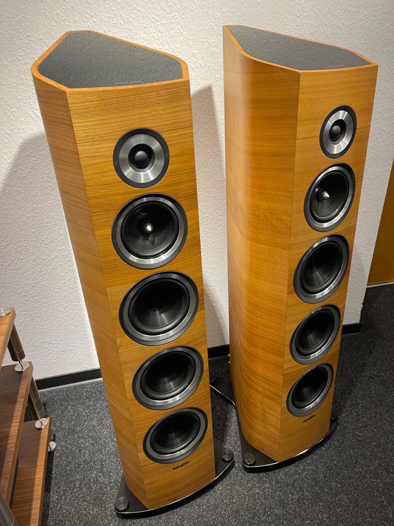 Die drei Bassmembranen der Venere S bestehen aus Aluminium. Sie sind besonders leicht und dabei zugleich extrem steif, was für einen schnellen Antritt und feine Auflösung selbst bei tiefsten Frequenzen sorgt. Die gebürsteten Aluminium-Zierringe um die Treiber verleihen der Lautsprecherfront einen besonders edlen und hochwertigen Charakter – ohne sichtbare Schrauben. Die bei den anderen Venere-Modellen eingesetzte Basisplatte aus Glas wurde durch eine Platte aus gebürstetem Aluminium mit Diamant-Phase ersetzt, was dem Look der Venere S eine noch feinere Note verleiht.