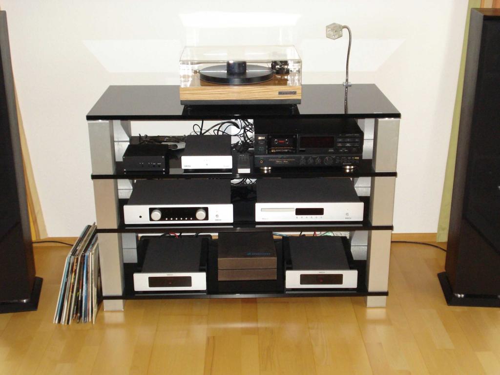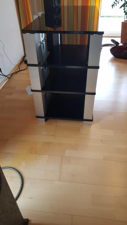 High-End Rack mit 19mm starken Glasebenen in Klarglas und 80x80mm Aluminiumsäulen