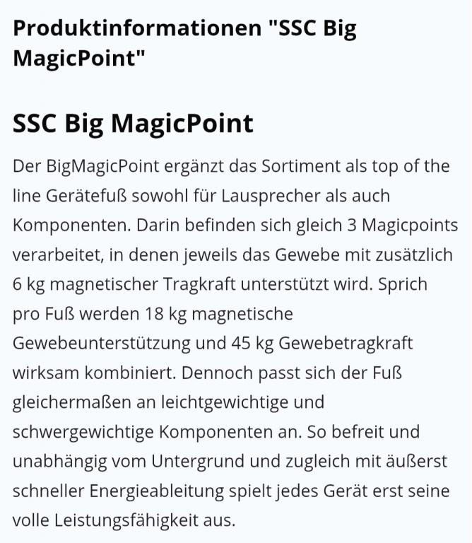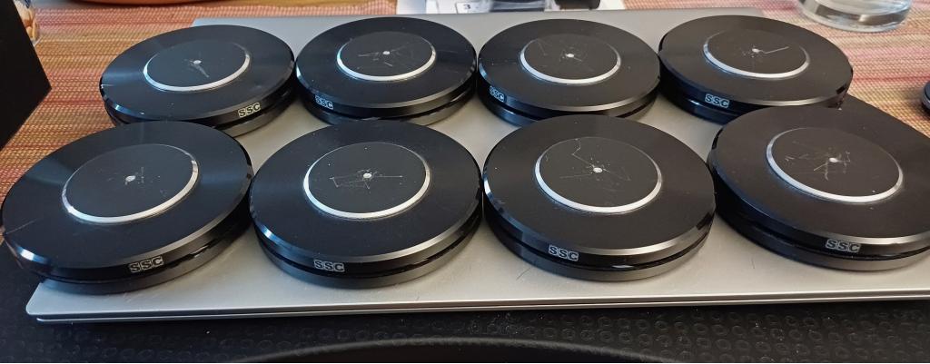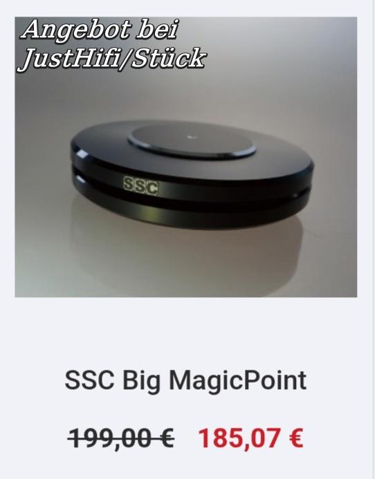 Zu verkaufen habe ich die das Klanggeschehen aufwertenden Gerätefüße von SSC, in der Ausführung Big MagicPoint (nicht zu verwechseln mit den günstigeren MagicPoint), Farbe Schwarz/Silber, mit Spikeaufnahme.
