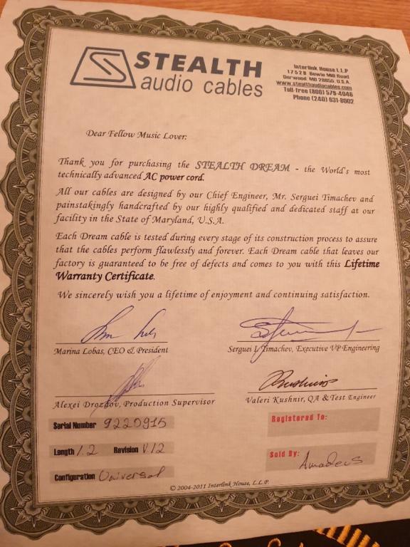 Stealth Dream V.12 Universal 1.2 meter 15 amp IEC Silver Schuko are new never used they are terminated whit on both ands Silver plugs original Bag and Certificate is included.