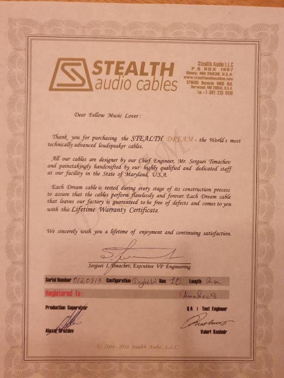 Dream Loudspeaker cable 2 meter Rev. 10 single wire upgraded by Stealth Audio to Silver Spades unused original bag and certificate included.