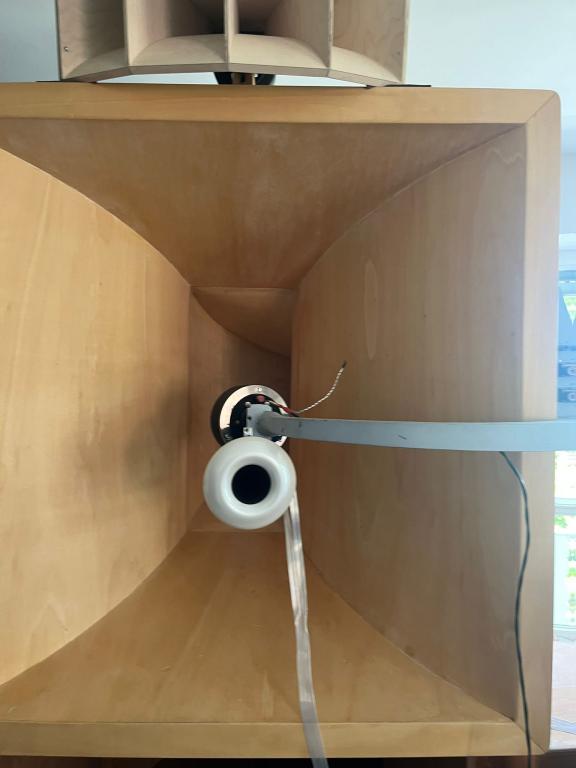 Satohorn, von Frank Göbel, mit Dämpfung. Bestückt mit dem von Dietmar Hampel gefertigten Umbau des Klipsch-Atlas Treibers mit Phenolharz-Membran. Er reicht unter 200 hz. Im Sato hängt es vom Raum ab, wie tief es geht.