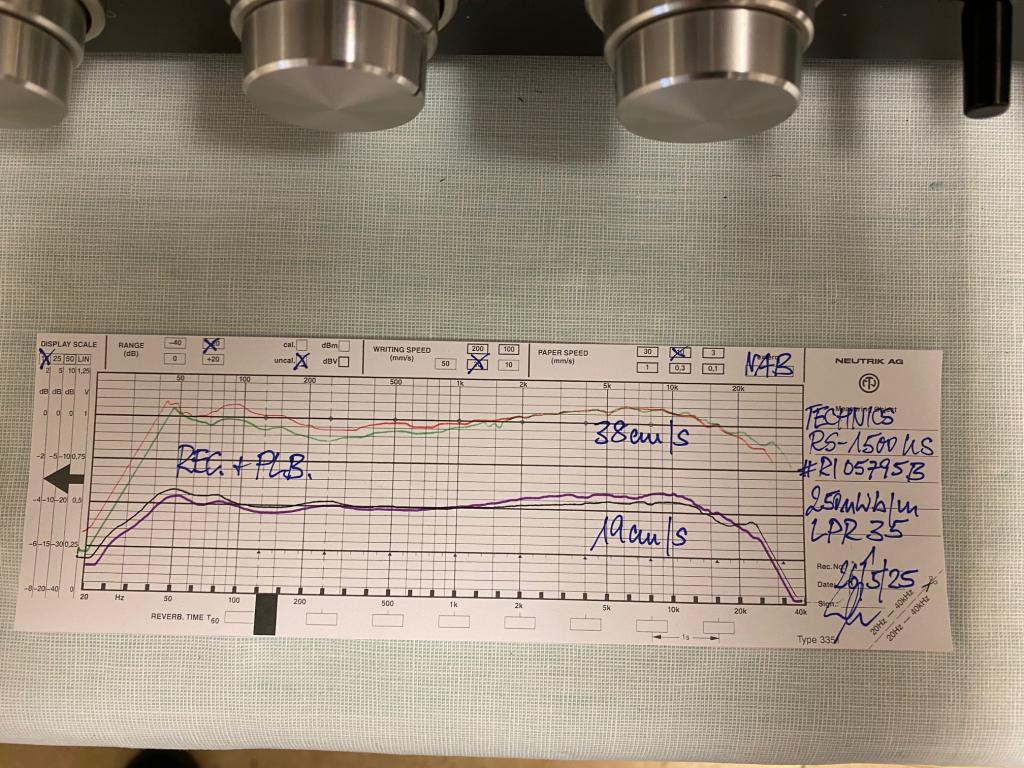 Die hier angebotene Maschine etwa von 1982 ist in sehr gutem Zustand mit wenigen Gebrauchsspuren (lediglich auf der Rückwand) und hat sehr gute Köpfe. Sie wurde jetzt vollständig restauriert im EternalArts Audio Labor, das sich auf Bandmaschinen spezialisiert hat. Dabei wurden alle Funktionen geprüft und überarbeitet, Mechanik, Bremsen, Bandlauf und Köpfe neu justiert sowie gealterte mechanische und elektrische Bauteile ausgetauscht, wo immer sie grenzwertig waren. Eingemessen wurde sie dann auf LPR35, dem Langspielband, das nach wie vor gefertigt wird. Der Messschrieb des Neutrik Audiographen zeigt die Qualität unserer Restauration und der Köpfe. Das Gerät weist ausweislich des Frequenzgangs weit bessere Daten auf als die seinerzeit vom Hersteller propagierten Werte.