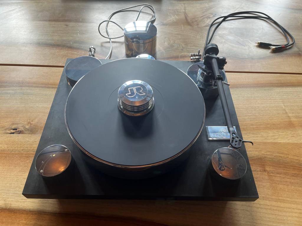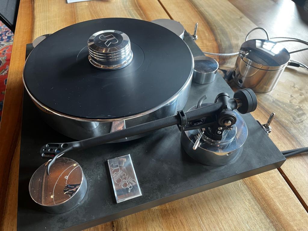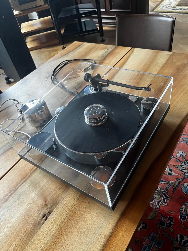 Wir bieten im Kundenauftrag einen Transrotor Bellini TMD mit Schiefer Zarge an. Montiert ist ein Rega RB 330 Tonarm ohne System. Zum Angebot gehört eine absolut perfekte Staubschutz Haube und das Konstant eins Netzteil ( Dadurch lässt sich gegenüber der Grundversion die Drehzahl am Netzteil umschalten ohne den Riemen am Motor zu manipulieren).Wir geben 12 Monate Garantie auf dieses Gerät.