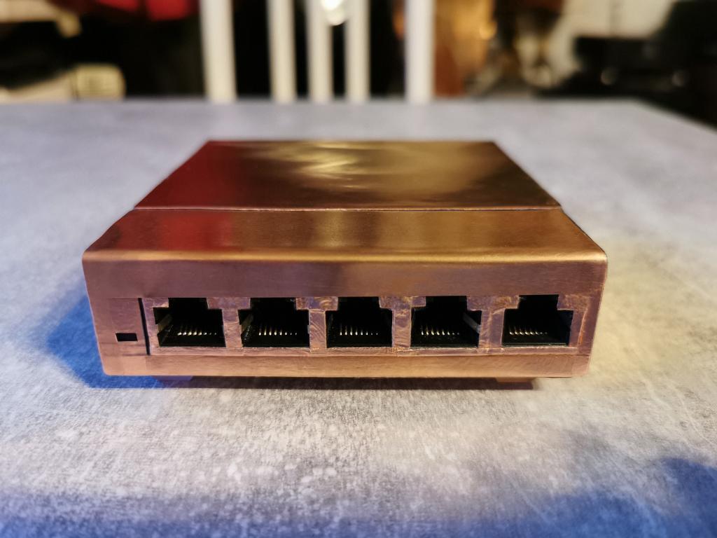 Alle Kanten aus Kupfer sind entgratet und wenn man von einem normalen Verbraucher ausgeht, bestehen bei einer typischen Verwendungsweise keine Gefahren. Der Switch kann mit jedem 12V / 1A Netzteil betrieben werden.